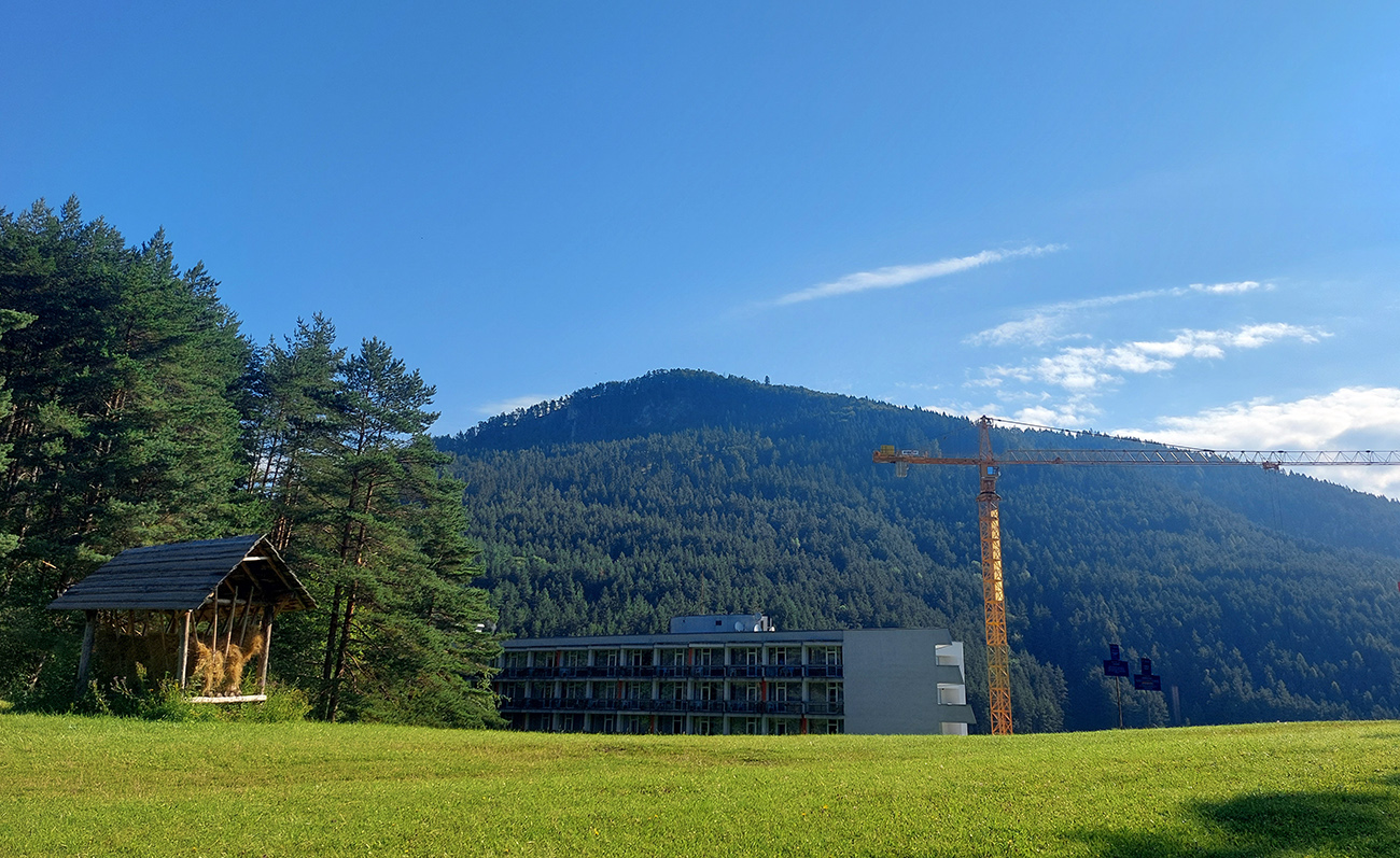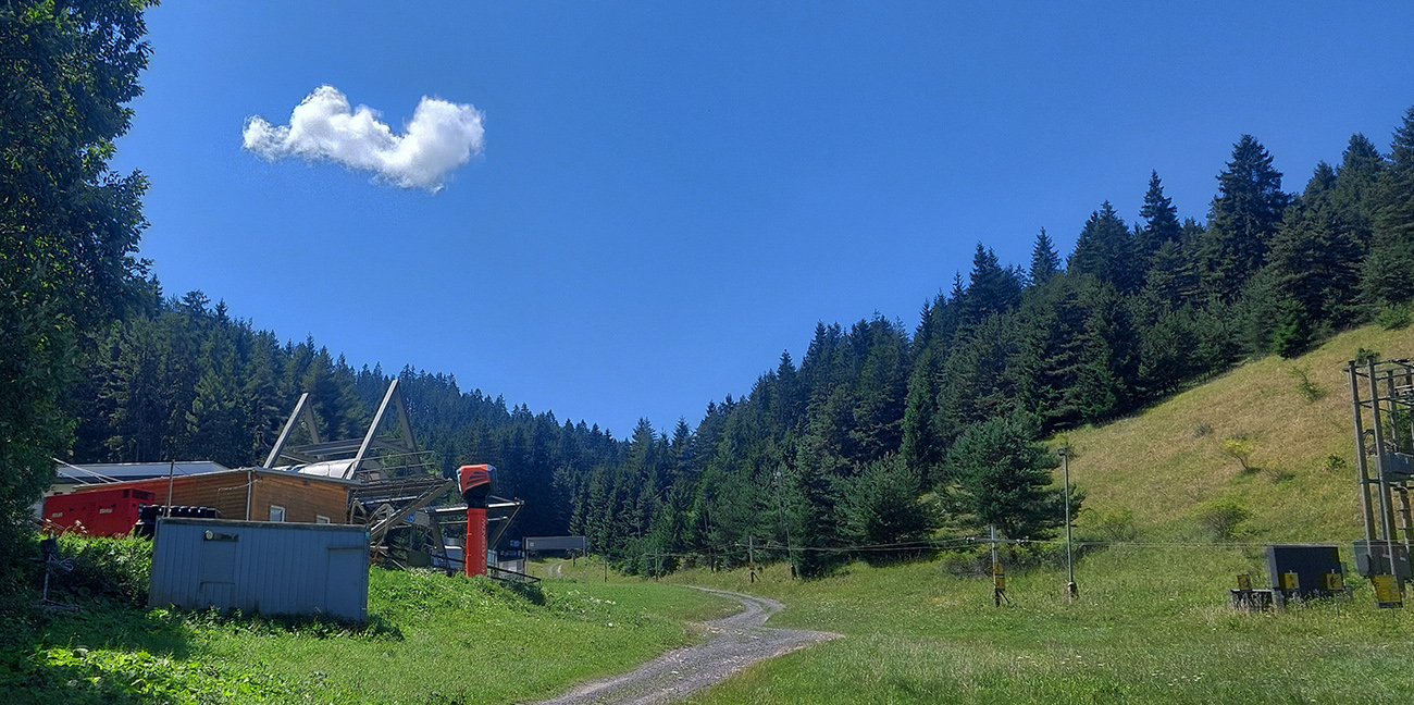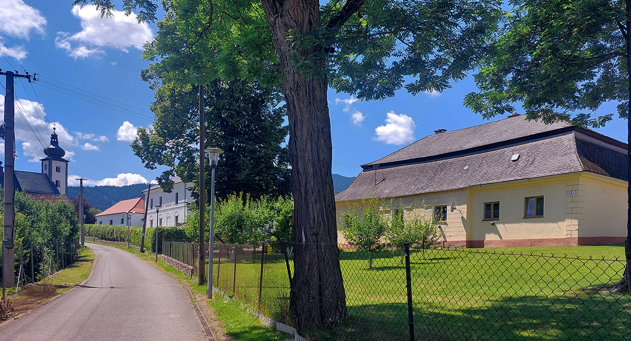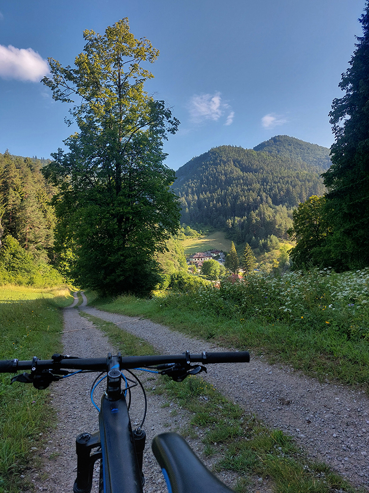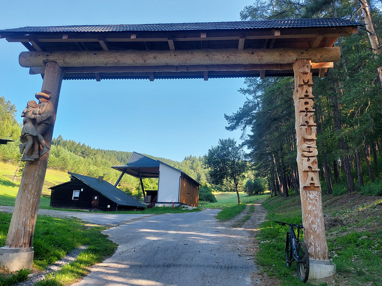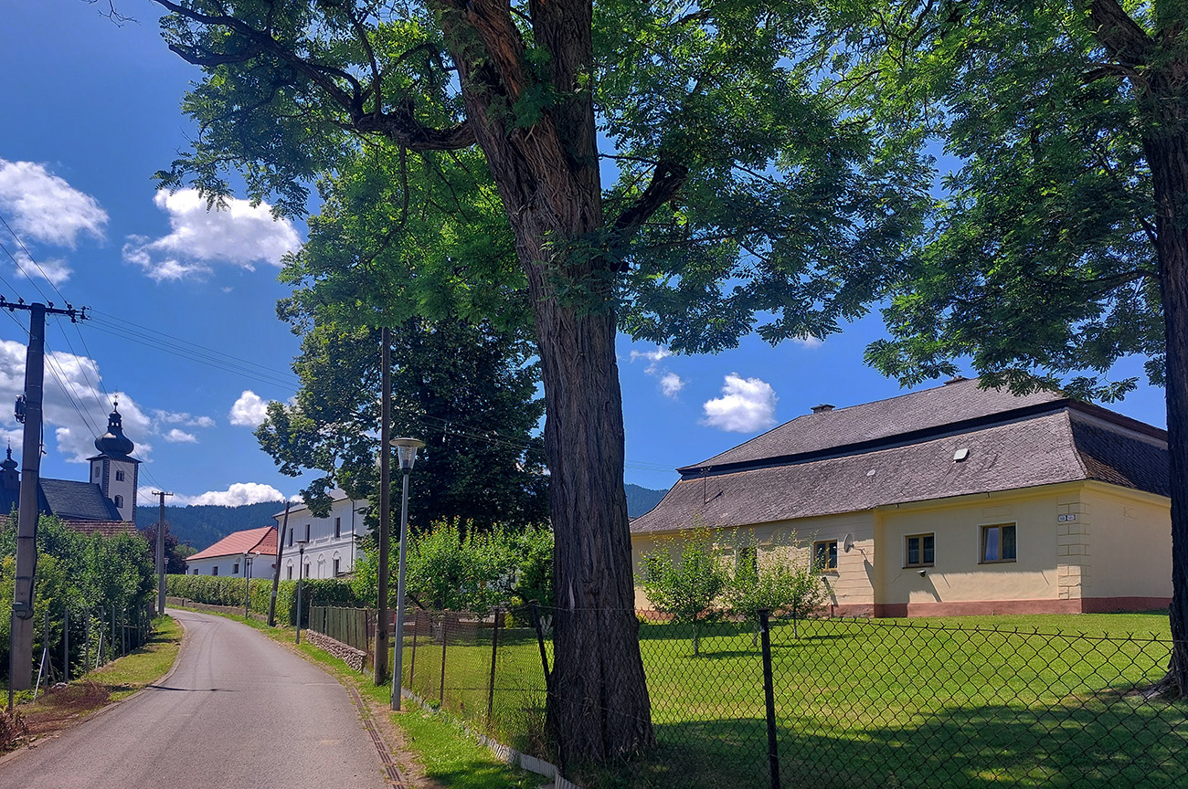 V okolí ústia Demänovskej doliny kopec gýčových dreveníc, vypipľaných chát a atrakcií pre turistov, pod kolesami sa strieda asfalt, šotolina aj tráva, len zľava stále les a doprava výhľady k Mikulášu cez guľaté pahorky podhoria. Plošín, Pavčina Lehota. Lazisko som obišiel ponad domy, cez lúku parádne vyjazdená stopa od bicyklov. Zámer zájsť si aj k najväčšiemu drevenému kostolu u nás síce bol, ale už som tam bol, nechcelo sa mi už.