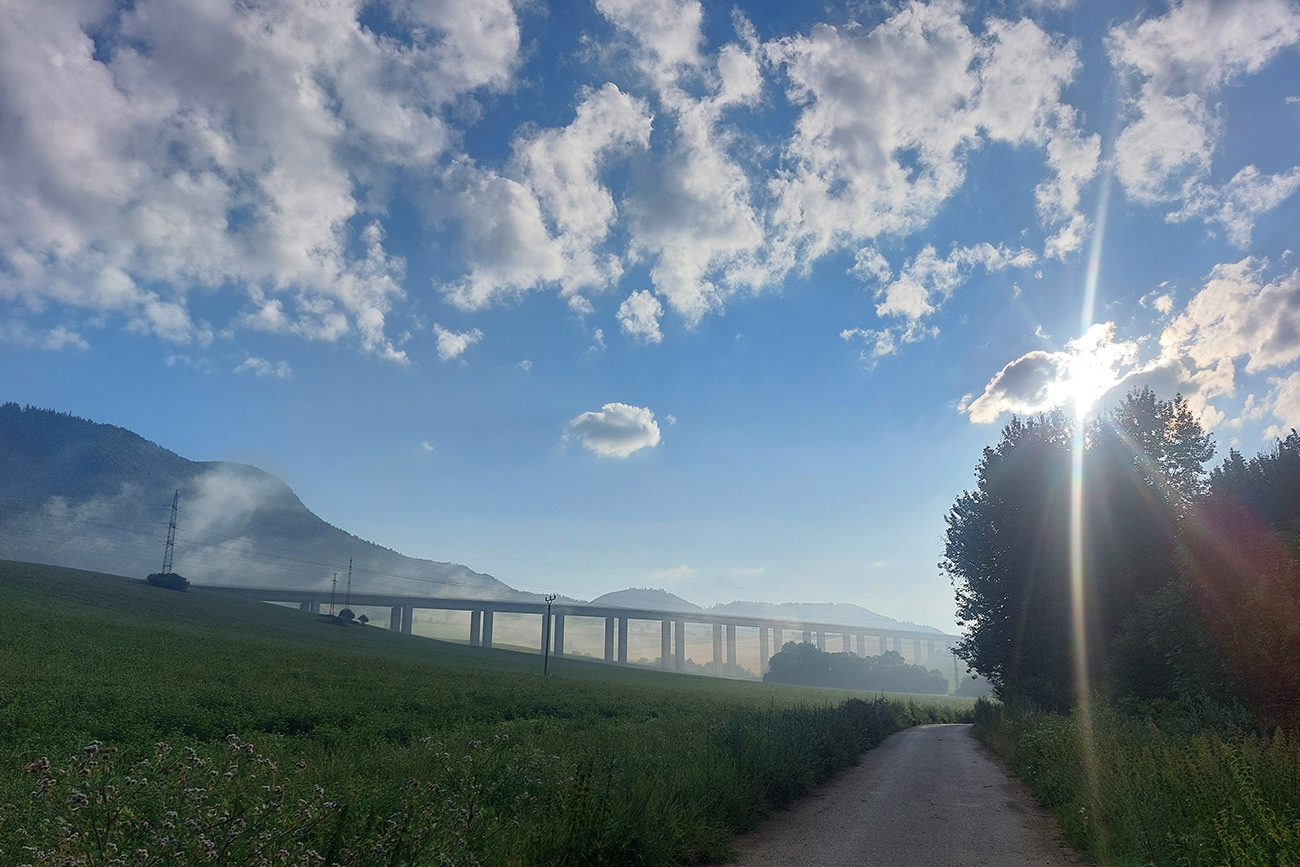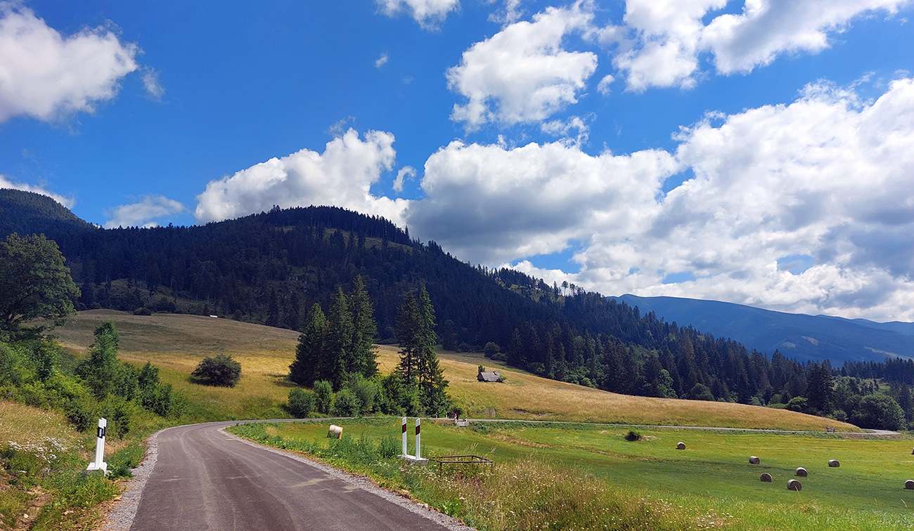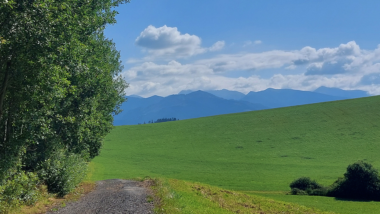 Matiašovce – len skok cez hlavnú a začína jedno z najdlhších stúpaní na trase. Ale plynulé, v tieni a po klasickej, starej, asfaltovo-šotolinovej ceste. Za rázcestím Noviny však šok – nový asfalt, široký na dva kamióny. S prestávkami v podstate až na Bobroveckú vápenicu. Krajina lúk a solitérnych stromov okolo cesty ale pekná, nad hlavou dominujú Babky - presunul som sa pod Západné Tatry.