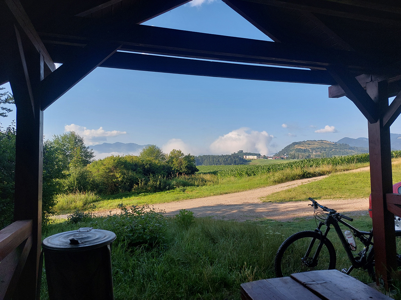 Medzi ústím Dúbravskej a Ľupčianskej doliny, ponad Kľačany, pod kolesami dominuje hlina a tráva, výhľady doprava ostávajú, cesta vedie viac z kopca, len s malými brdkami na spestrenie. Na konci parádne oddychovisko, presne pre cykloturistov - využil som na posedenie a pojedenie. Už som vedel, že časovú rezervu ku vlaku mám.