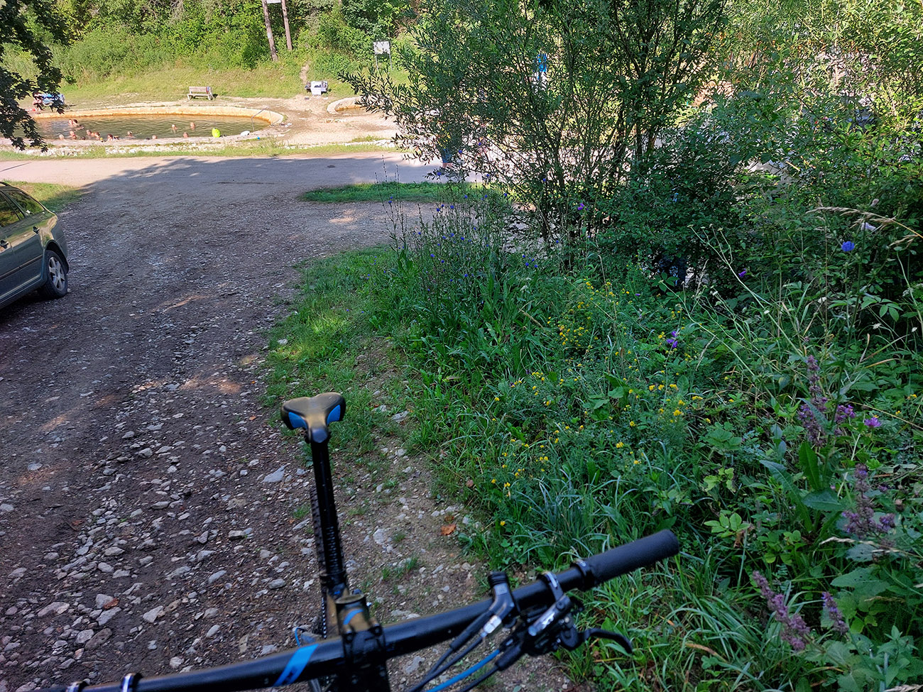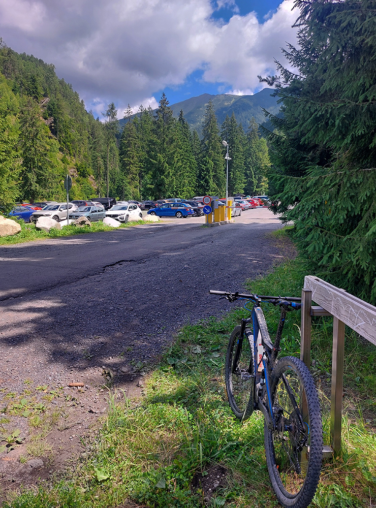 Do Žiarskej doliny po Tatranskej magistrále – na úvod šutre a potom krátka strmina, no ako v Tatroch :-) Ale jazditeľné všetko a potom zas pekné lúky, zopár brodov, druhé tankovanie z prameňa priamo pri ceste, výhľady len doprava do podhoria a na konci frmol na plnom parkovisku.