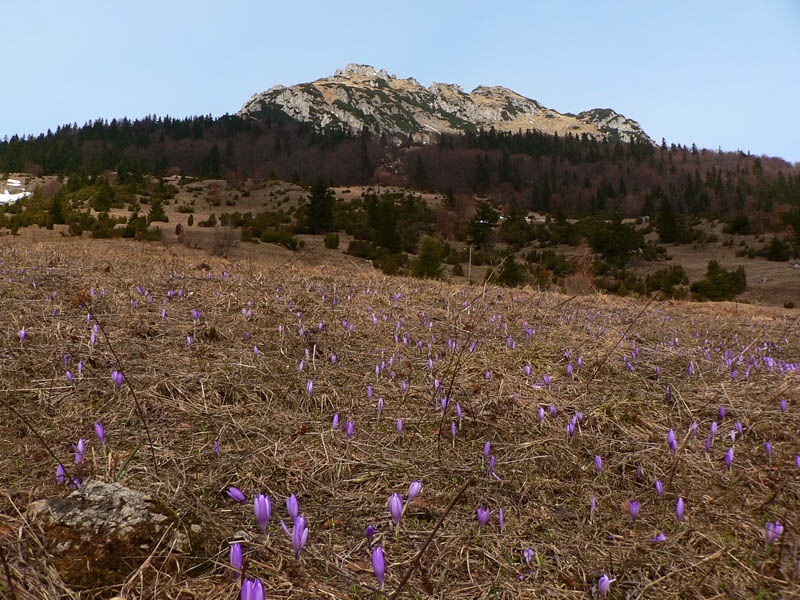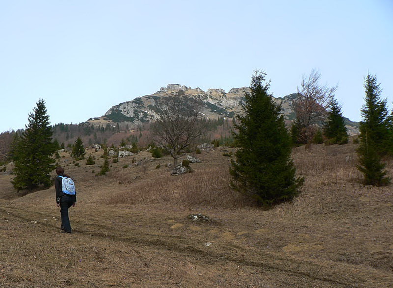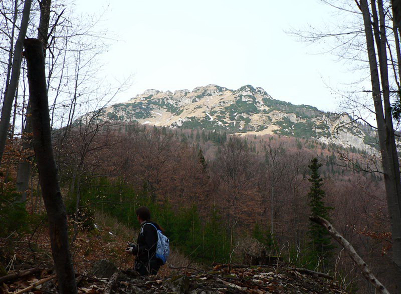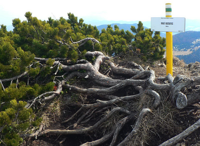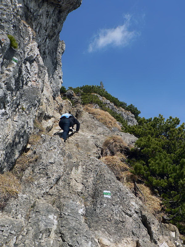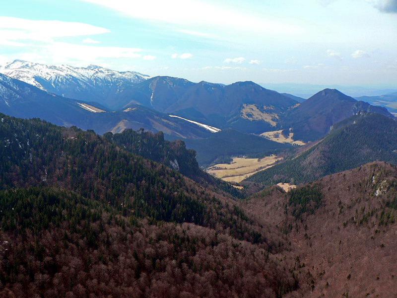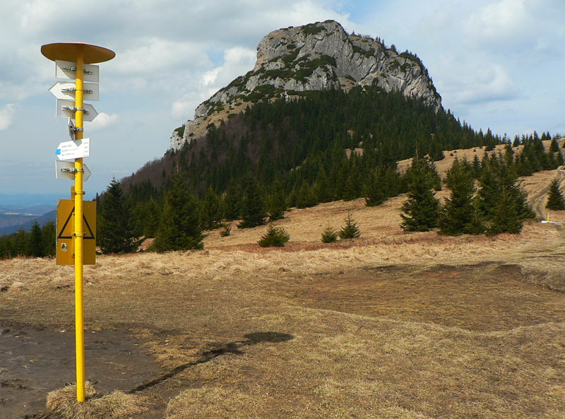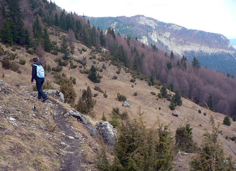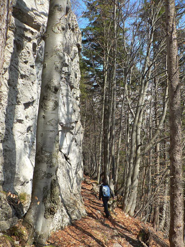 Samozrejme že napriek tomu vidieť vo svahu ľudí. Vraciame sa k nižšiemu rázcestiu (smerovník pod Rozsutcom) a pokračujeme po modrej, traverzom východného svahu Veľkého Rozsutca do sedla Medzirozsutce. Chodník vedie najprv pasienkami (parádne výhľady na východ), v druhej polovici lesom. Miestami je ešte nepríjemný ľad, poskrývaný pod hrubými nánosmi bukového lístia. Tesne pred vynorením z lesa na Medzirozsutcoch trčia vo svahu zaujímavé skalky a z nich je pekný pohľad na sedlo aj Malý Rozsutec. Na ten je výstup povolený, takže neváhame a o polhodinku už si vychutnávame kruhový výhľad z vrcholu. Spestrením je v oboch smeroch exponovaná skalná pasáž, zaistená reťazami, ale teraz v predjarí aj ľad v lese.
