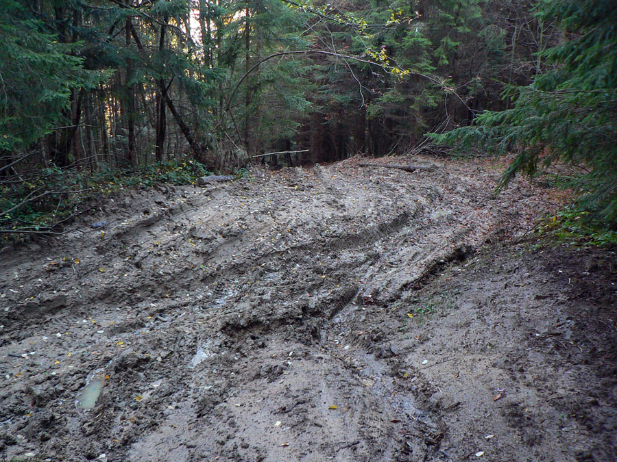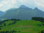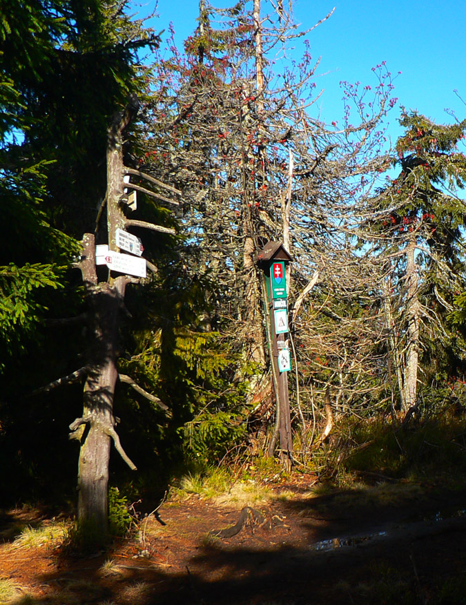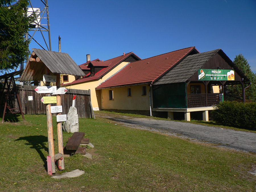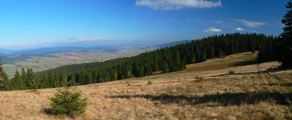 Na Javorovej tma ako v rohu, samý smrek :-) Vľavo vbok na červenú a začiatok zostupu - nasleduje parádna kĺzačka po blate, ktoré namiesili traktory. Našťastie to netrvá dlho a po nejakých 20 minútach sa vynáram na lúkach nad sedlom Príslop. Úplne iný svet, vidieť do ďaleka: na severe v opare Piľsko a Babia hora, na juhu pod slnkom obrysy Veľkej Fatry. Ešte aj kravy sa tu pasú na zvyškoch trávy.
