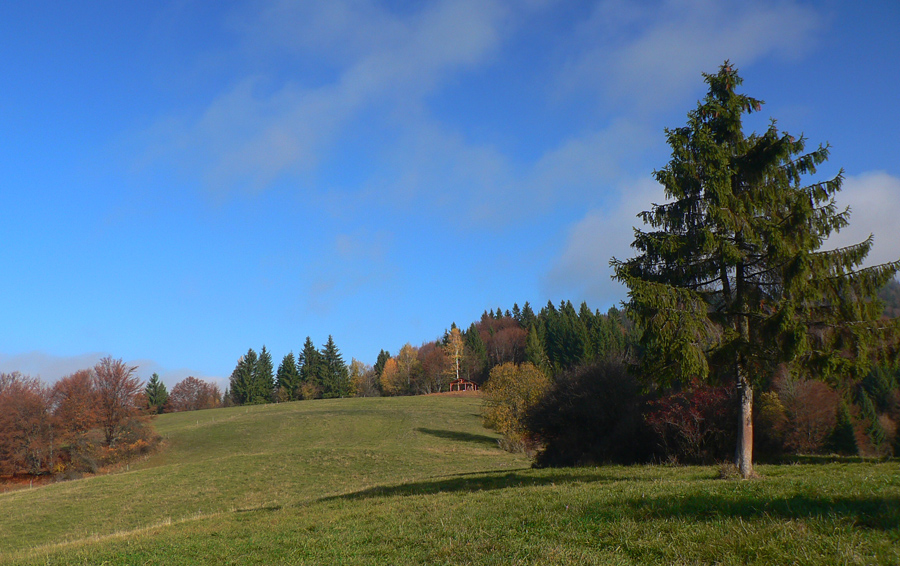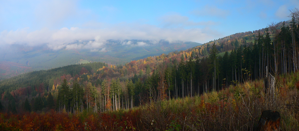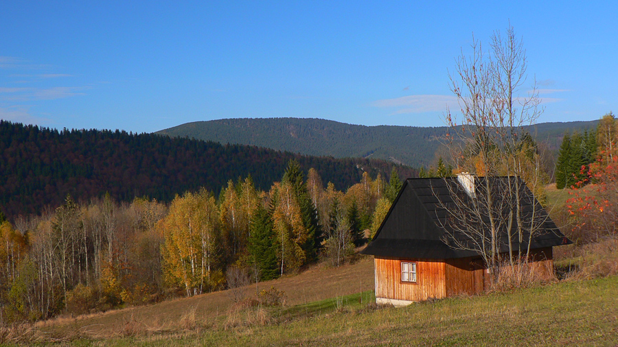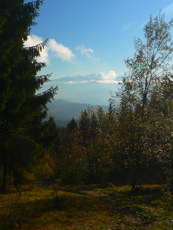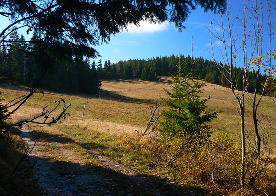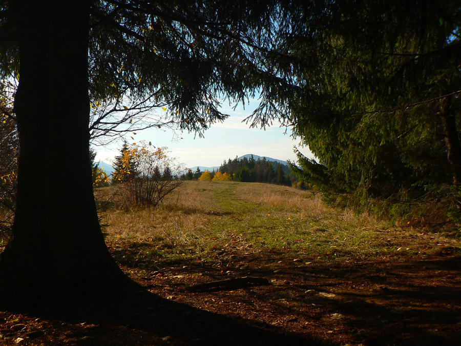 Októbrové farby babieho leta zaháňajú nudu aj na trasách vedúcich prevažne lesom, ktoré sa zdajú inokedy monotónne. Táto ale okrem lesných úsekov sľubuje podľa mapy aj časté hôľne a lúčne pasáže, otvorené do krajiny. Takže ideme na to! Ráno sa v doline Oravy prevaľujú chuchvalce hmly, ale nad nimi čoraz viac presvitá predpoveďou sľubovaná modrá. Pod nohami „pofrontové“ blato strmej cesty lúkami, ale nie je to až také zlé, už je dosť pokryté opadanými listami.