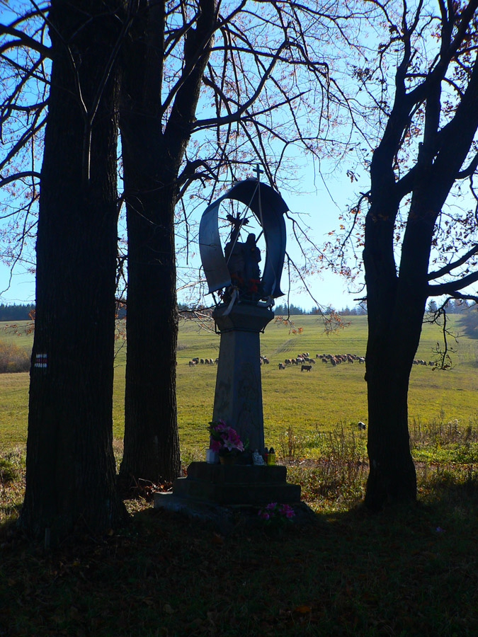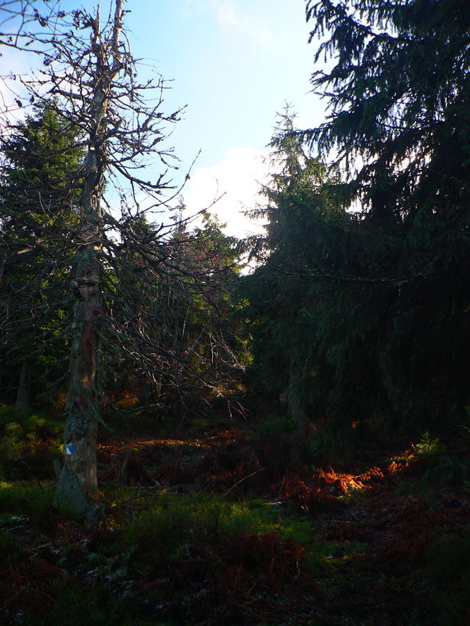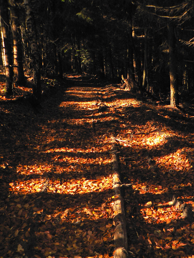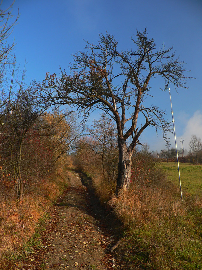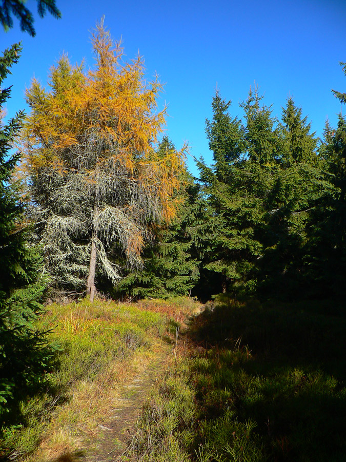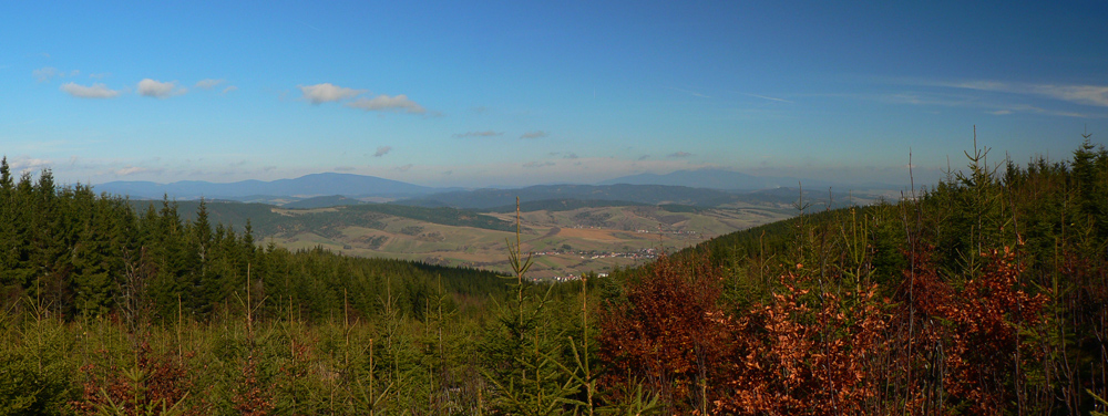 Októbrové farby babieho leta zaháňajú nudu aj na trasách vedúcich prevažne lesom, ktoré sa zdajú inokedy monotónne. Táto ale okrem lesných úsekov sľubuje podľa mapy aj časté hôľne a lúčne pasáže, otvorené do krajiny. Takže ideme na to! Ráno sa v doline Oravy prevaľujú chuchvalce hmly, ale nad nimi čoraz viac presvitá predpoveďou sľubovaná modrá. Pod nohami „pofrontové“ blato strmej cesty lúkami, ale nie je to až také zlé, už je dosť pokryté opadanými listami.