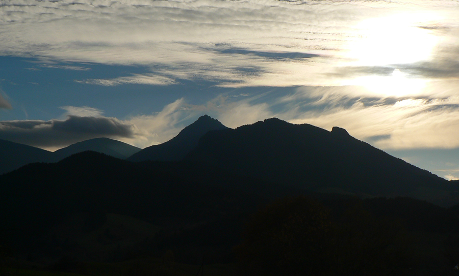 A nasleduje posledná etapa: strmý, asi trištvrtehodinový zostup lesom, kým sa nevynorím na lúkach nad Zázrivou. Chodník sa postupne zas mení na zvážnicu a blata pribúda. Aj na lúkach, lebo jalovice tiahli... Ale čím nižšie, tým lepšie, takže sa stíham zbaviť blata na podrážkach a s ním aj obáv, či ma šofér vezme do autobusu :-) Poslednými kulisami predstavenia sú obrysy Rozsutcov a Stohu priamo oproti, pod lúčmi klesajúceho slnka. Ideálna jesenná prechádzka to bola!