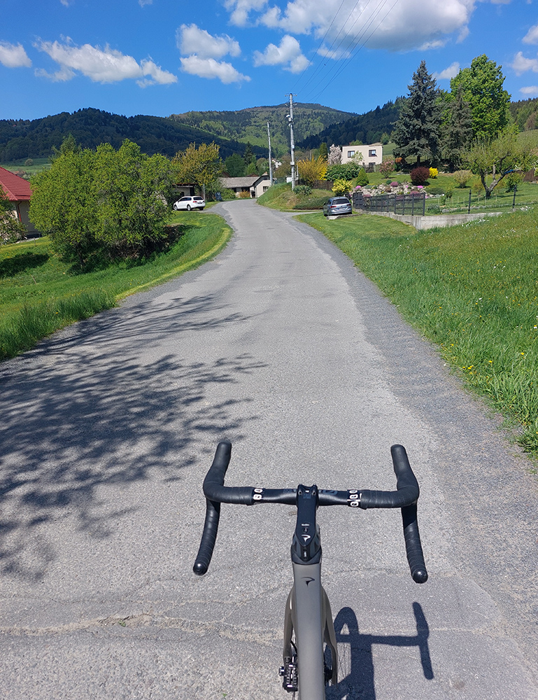 Po strmšom začiatku (asi 700 metrov po odbočku) je prvých pár kilákov stúpanie dosť nerovnomerné, párkrát cesta aj máličko klesne. Je tu málo tieňa, lazová krajinka je otvorená. Len spočiatku, dole pri potoku, je ho viac. Ale oplatí sa obzerať, estetika okolia na vysokej úrovni. Asfalt kadejakého veku, ale zväčša dobrý, aj keď starší, len niekde treba dávať pozor na ojedinelé, malé výtlky. Krátke rovinky striedajú výživné stojky, z pasienkov pozerajú kravy, z dvorov vyskakujú traktory.