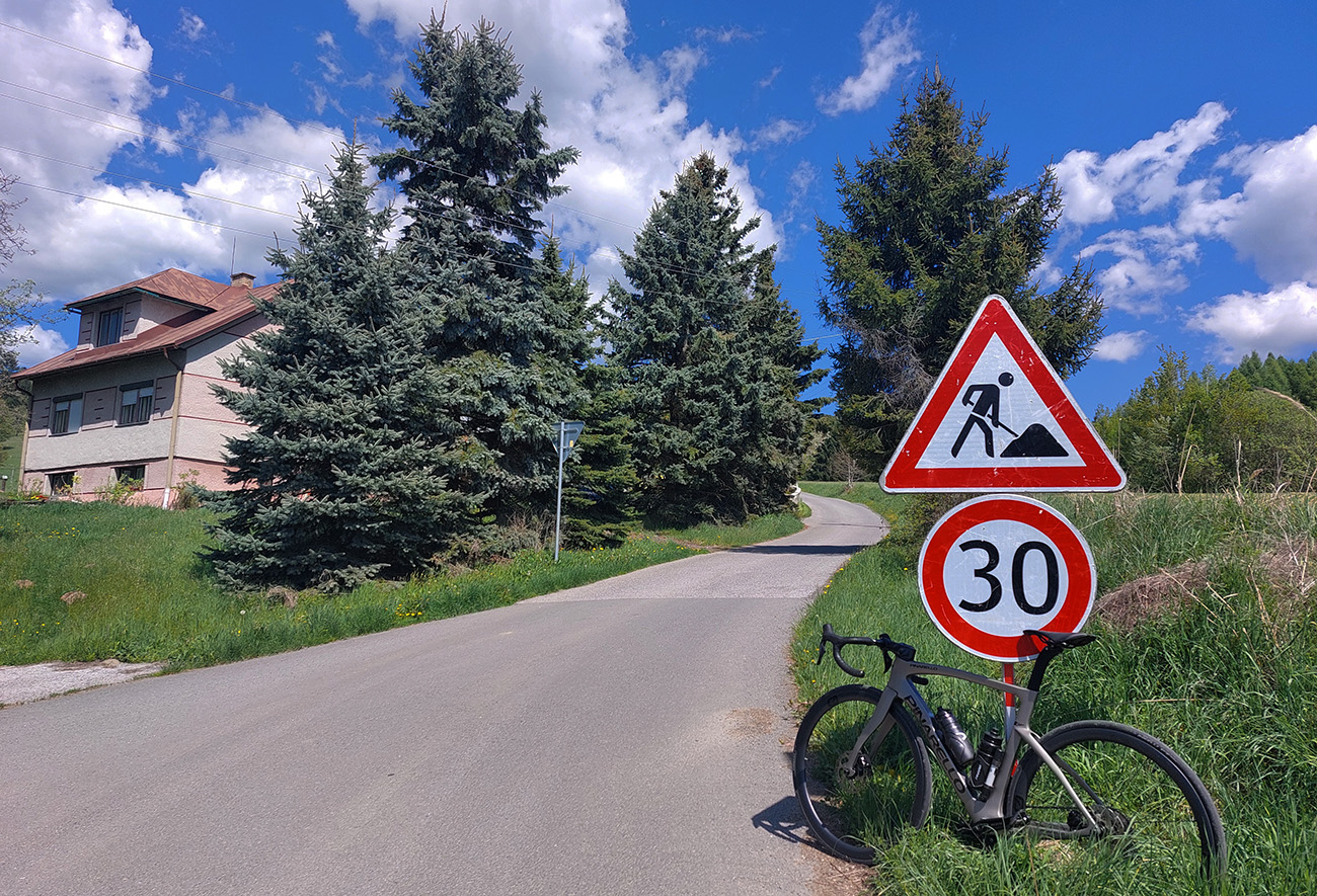 Druhý raz sa to dvihne na križovatke: Poľana doľava, doprava Snohy. Potom sa sklon už drží stabilne okolo 10%, často aj cez. Až po tú spomínanú križovatku, to sú nejaké dva kiláky – len kúsok pod ňou sa trochu zmierňuje. Tu je asfalt starší, ale stále dobrý, opravené sú len mostíky a priepusty: