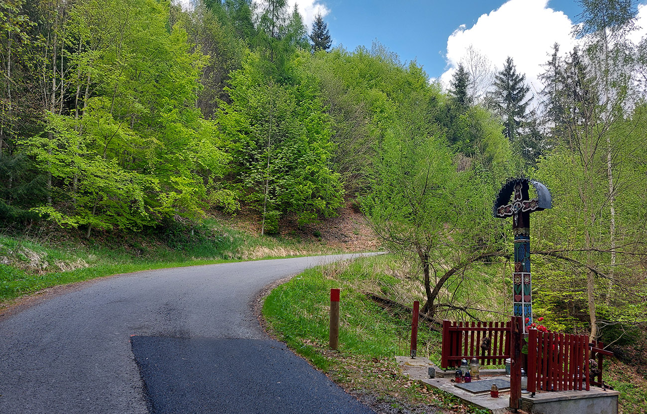 Pri posledných domoch miestnej časti Priehalina odbočka doprava, zas do strmého. Šípka navedie, značka snehových reťazí pomôže si uvedomiť. Cesta vchádza do lesa a asfalt je zrazu čierny a hladký. Za horúceho dňa poteší poriadny tieň.