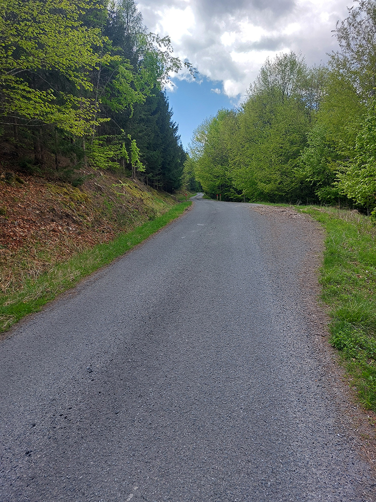 Cesta sa ešte trochu povlní hore – dole, a aj klesne na križovatku, kde sa sprava pripája ten druhý variant výšľapu od vodárenskej nádrže. Ten je pod križovatkou fajne výživný. V križovatke ale prudká zákruta doľava a tam práve začína príjemný, nie veľmi strmý, no najmä rovnomerný sklon.