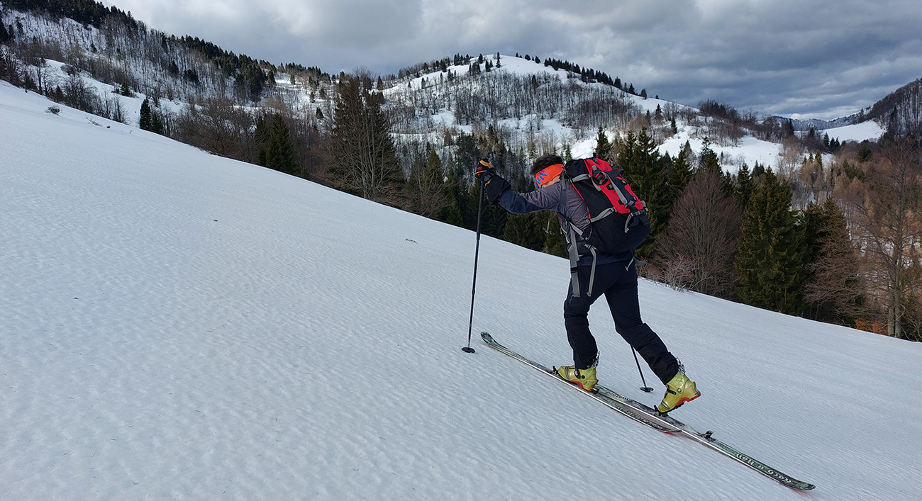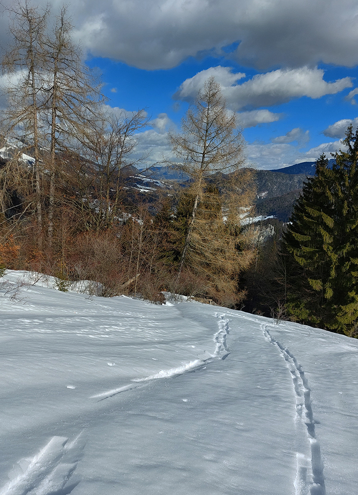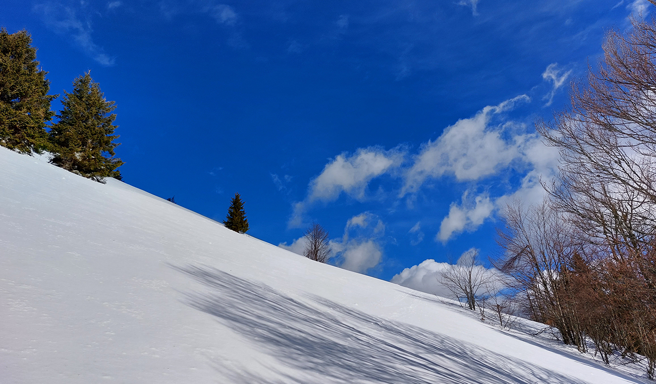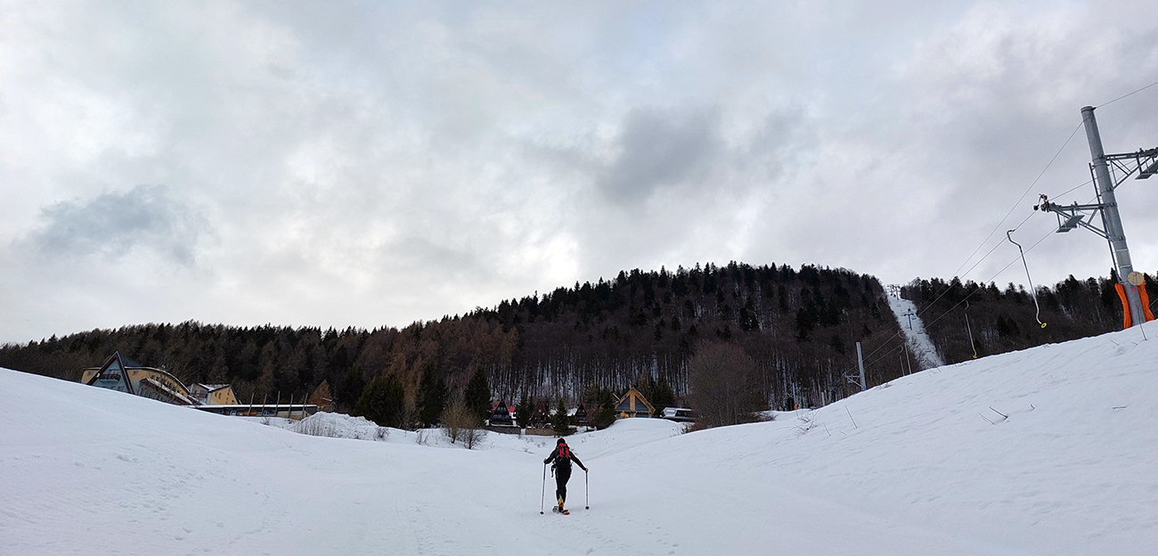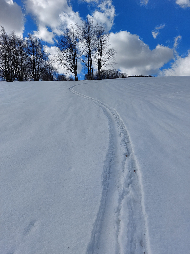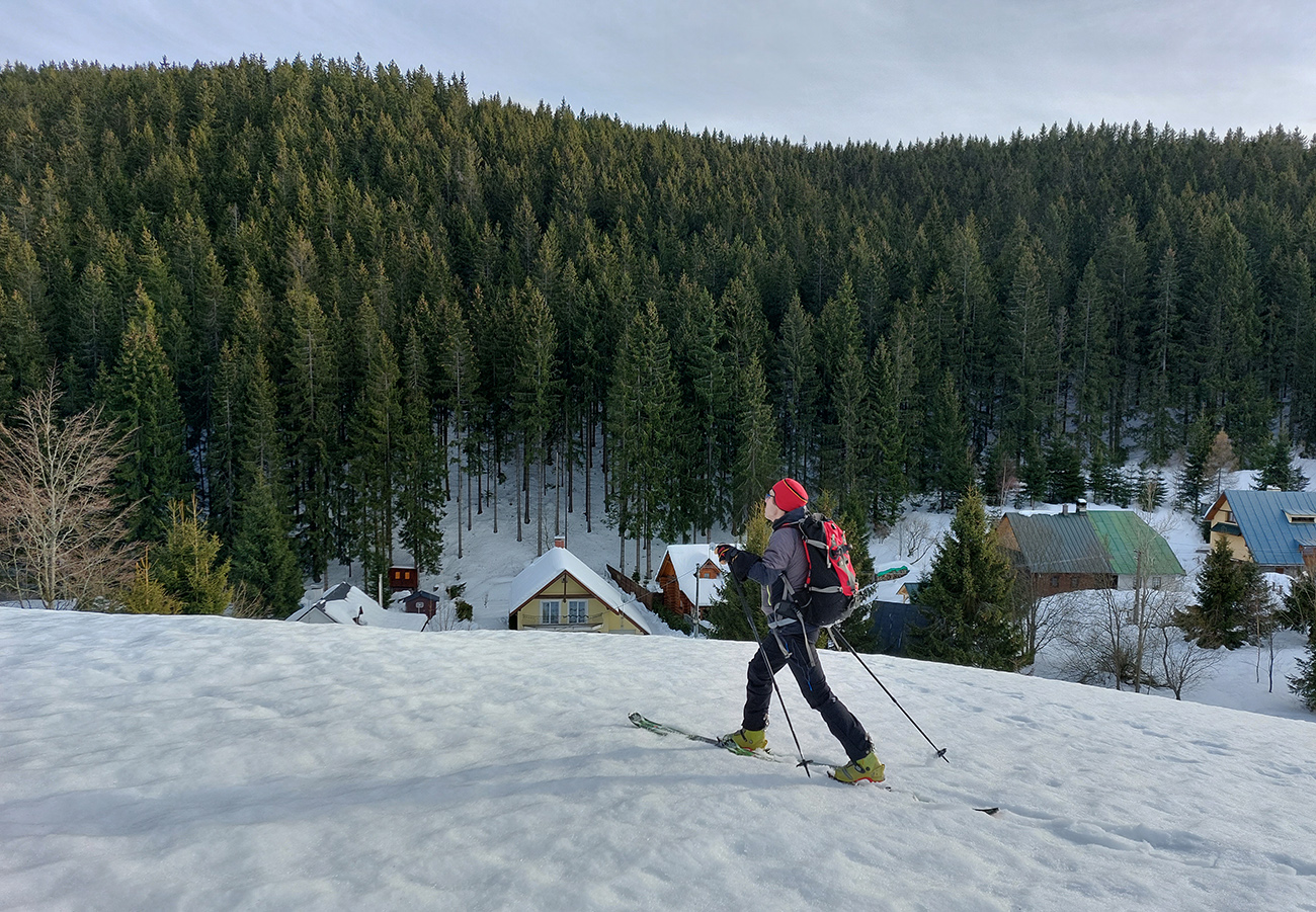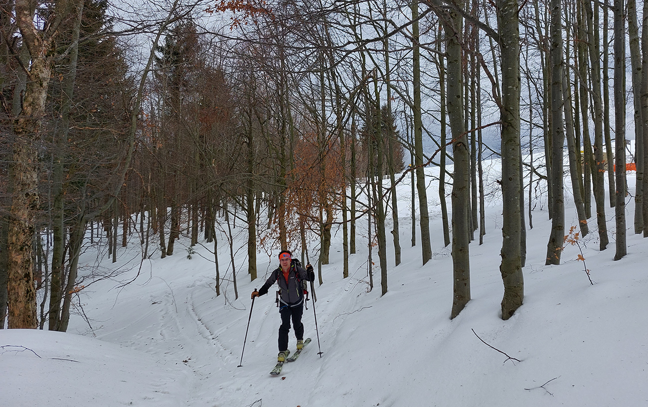 Trochu sme to tam poobchádzali po zjazdovkách a pomedzi chaty, nejako sme ten začiatok céčka netrafili, ale odmenou boli výhľady. Na Patočinách pri vleku sme sa konečne napojili a vliezli do lesa. Stopa betónová – až moc na to, ako malo byť v noci nad nulou. Ale slnko už sa prebíjalo cez rednúce mraky, tak bola nádej... C-trasa je inak hodnotená ako ľahká, pre začiatočníkov, že? Lenže jej záver pod hrebeňom je v traverze poriadnej strminy. No a teraz to bol čistý betón, poriadne sme zasekávali hrany a skoro sme aj haršajzne museli vytasiť. Tam ak by sa niekto menej zručný šmykol, aj sa zabije dole v lese – bola to poriadne nebezpečná kĺzačka. Takže asi tak: