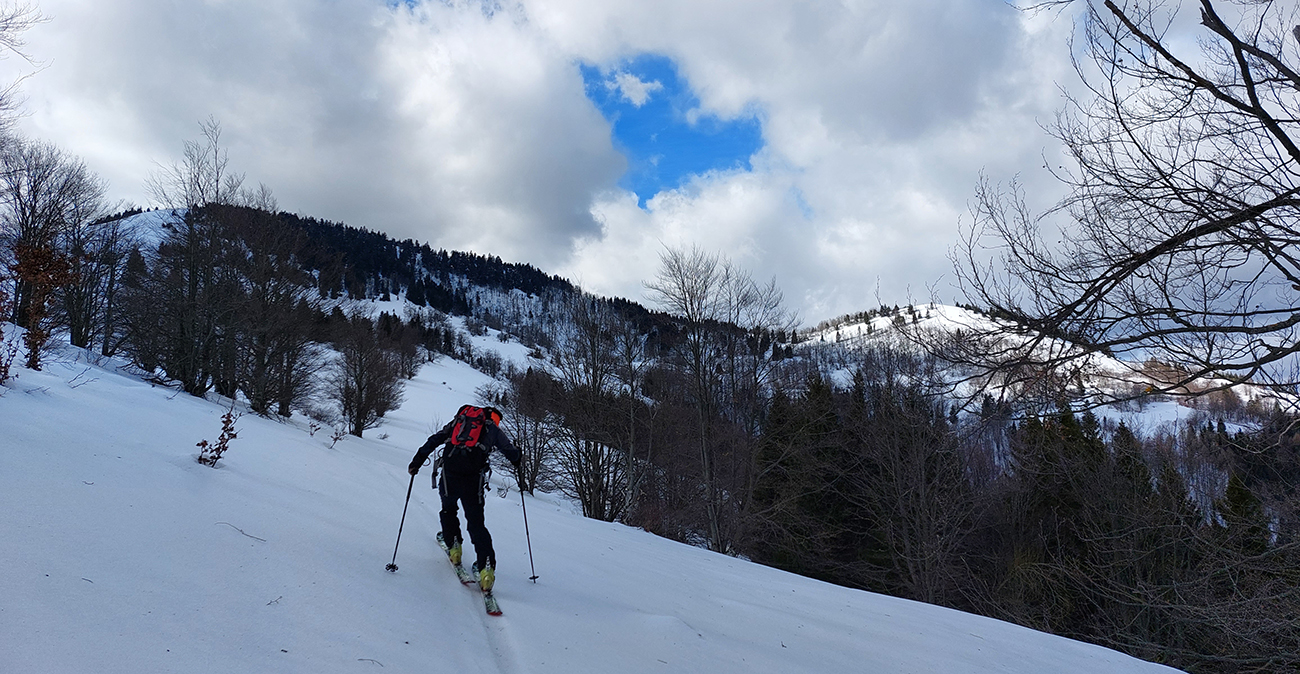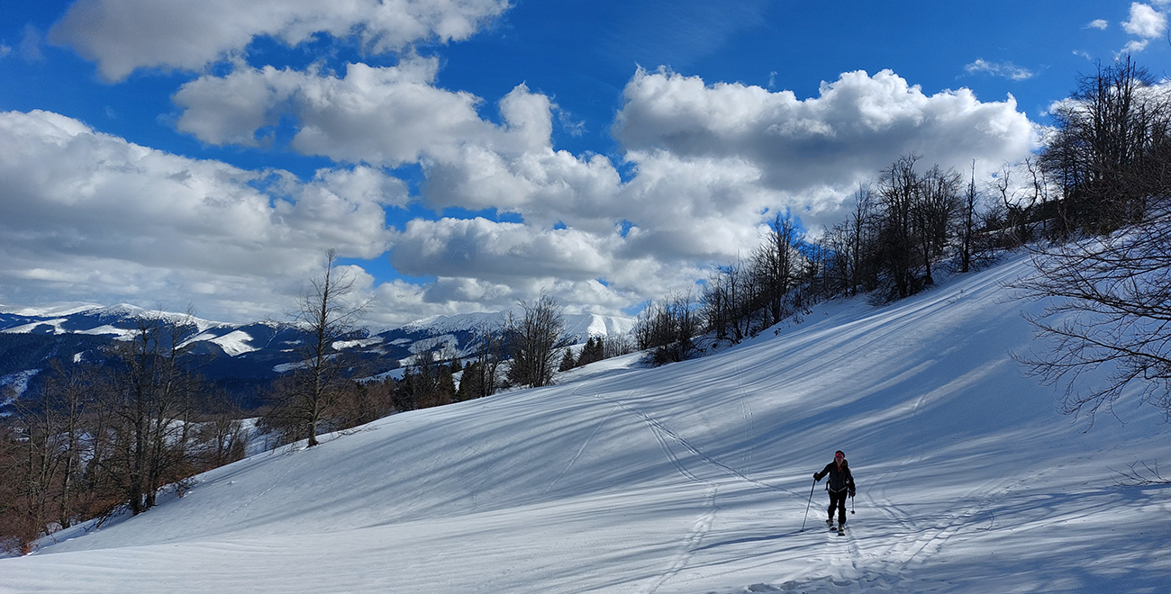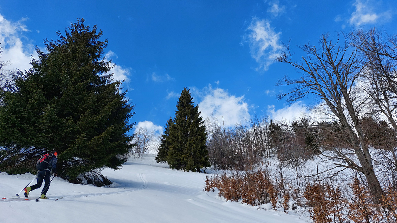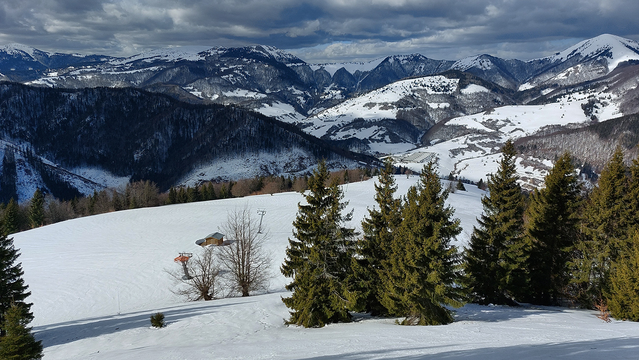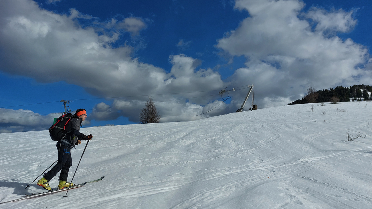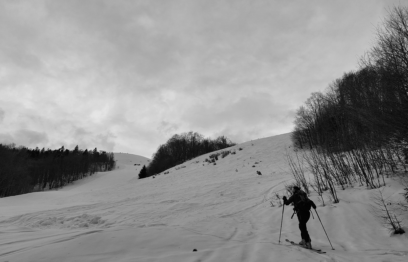 Trochu sme to tam poobchádzali po zjazdovkách a pomedzi chaty, nejako sme ten začiatok céčka netrafili, ale odmenou boli výhľady. Na Patočinách pri vleku sme sa konečne napojili a vliezli do lesa. Stopa betónová – až moc na to, ako malo byť v noci nad nulou. Ale slnko už sa prebíjalo cez rednúce mraky, tak bola nádej... C-trasa je inak hodnotená ako ľahká, pre začiatočníkov, že? Lenže jej záver pod hrebeňom je v traverze poriadnej strminy. No a teraz to bol čistý betón, poriadne sme zasekávali hrany a skoro sme aj haršajzne museli vytasiť. Tam ak by sa niekto menej zručný šmykol, aj sa zabije dole v lese – bola to poriadne nebezpečná kĺzačka. Takže asi tak: