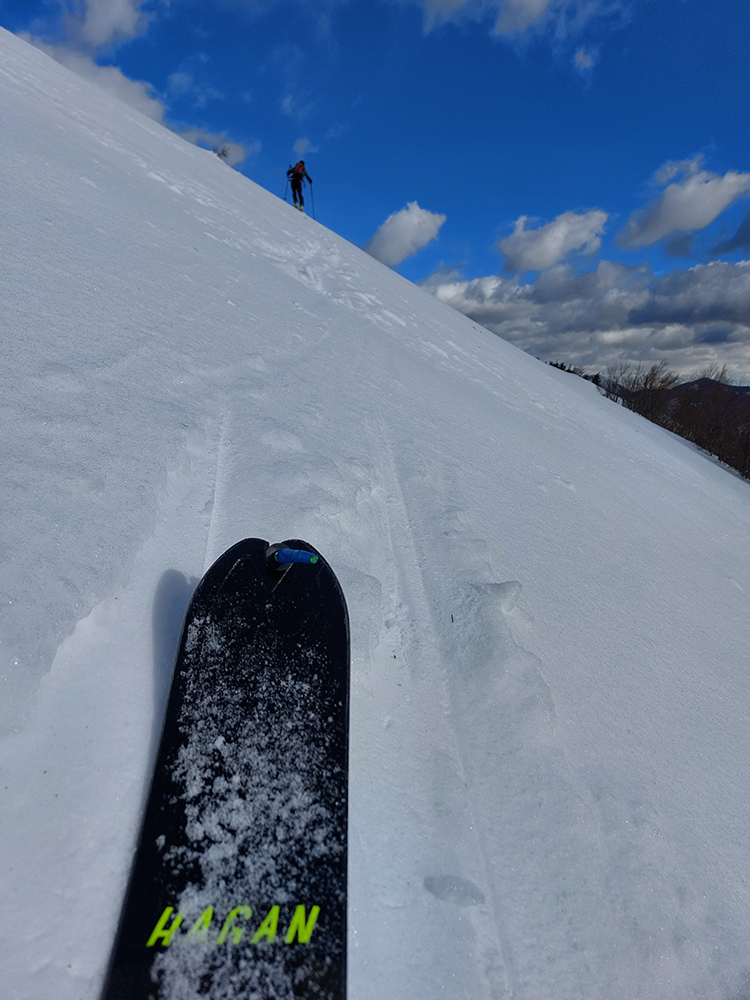 Nešli sme nazad na Malý, ale pekne poslušne po zelenej značke a ku dvojkrížu na Končitej, že skúsime zlyžovať na druhú stranu, popod vleky do Revúc. Dážď pekne zalial stopy predchodcov, tak sme sa aj tam trochu motali, ale pod vrcholom už sme čosi ako stopu našli. Hore zúril krtko a ten protivný vietor, tak rýchlo dole popri vlekoch. V istej výškovej „medzivrstve“ sa aj tu dal nájsť dobrý sneh na oblúky, ale aj tak prevažoval hore betón a nižšie prepadanie do kôry. Ani tu sme úplne dole radšej nezišli, nestálo to za to (okrem výhľadov):