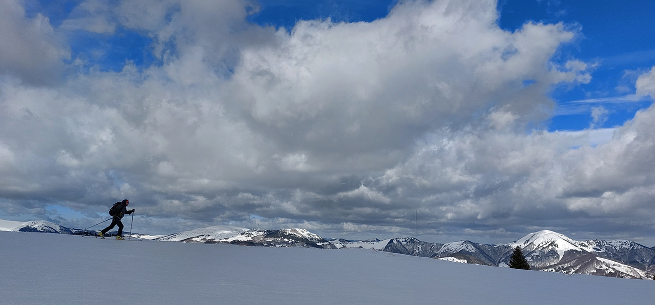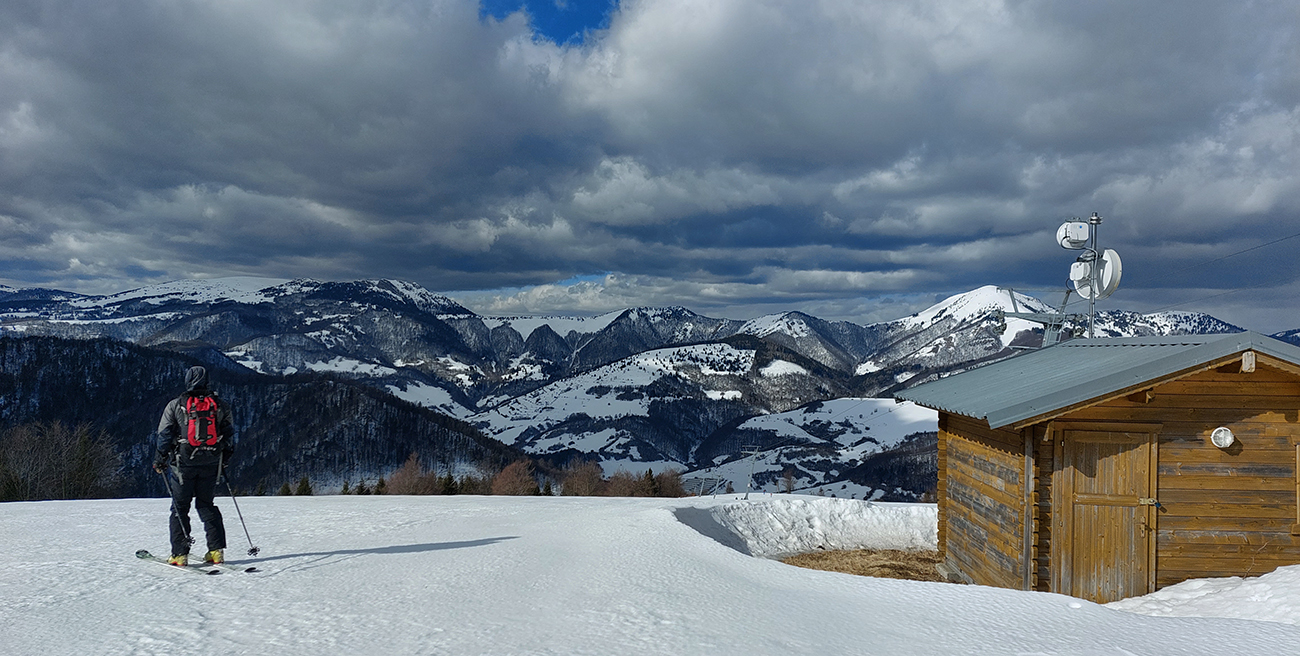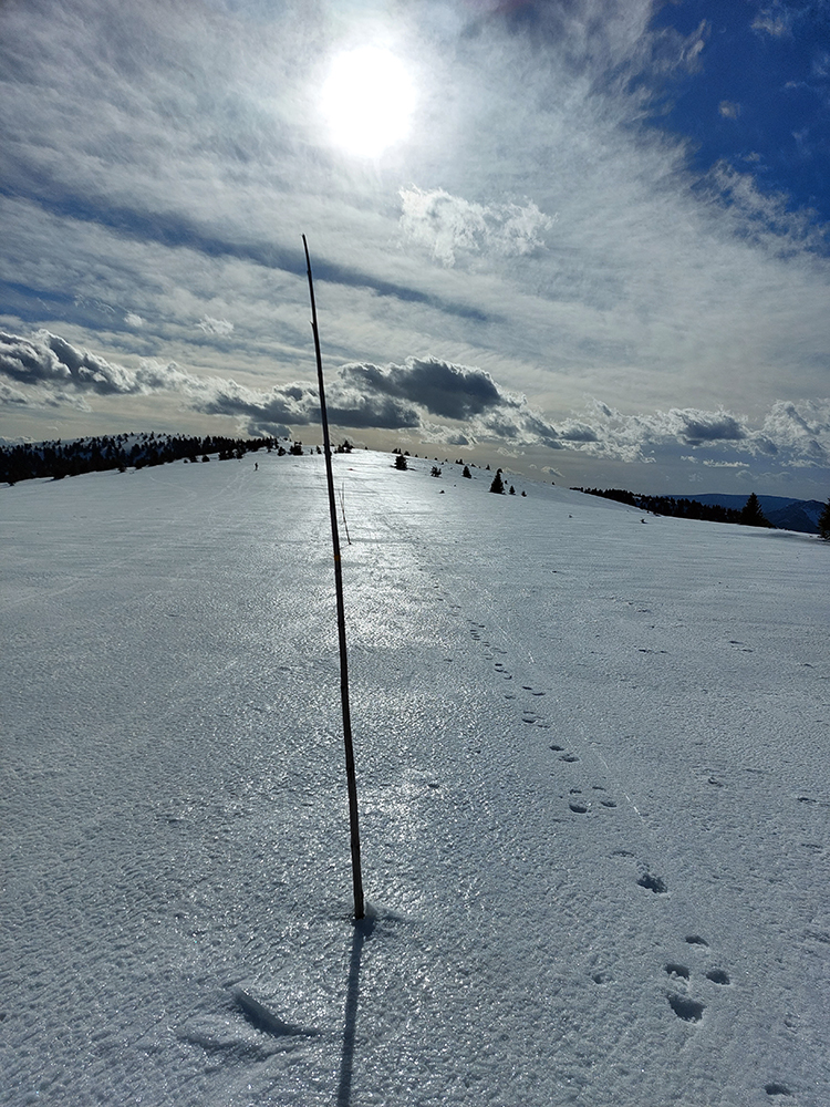 Ale nad nami už prevažne modro, na hrebeni krásne, ďaleké výhľady vďaka čistému, pofrontovému vzduchu. Len ten víchor – rýchlo het, na Malý Zvolen a z neho dolu! Posúvačka po hrebeni s poriadnym rachotom, ako po šmirgli keby sme išli, pásy si to odniesli... Lyžovačka dole po zelenej značke na východ s rachotom priam hromovým, srnky v lese museli kolabovať. Že nás aj poriadne pri tom vytriaslo, škoda spomínať. A čím nižšie, tým horšie nás kôrka niesla. Pod ňou pol metra vlhkej vaty. No nič moc teda, ani sme radšej úplne dole nešli. Ale o lyžby v tých podmienkach tiež nešlo. Aspoň sa dobre stúpalo potom nazad, ani stopu za sebou sme skoro nenechávali.