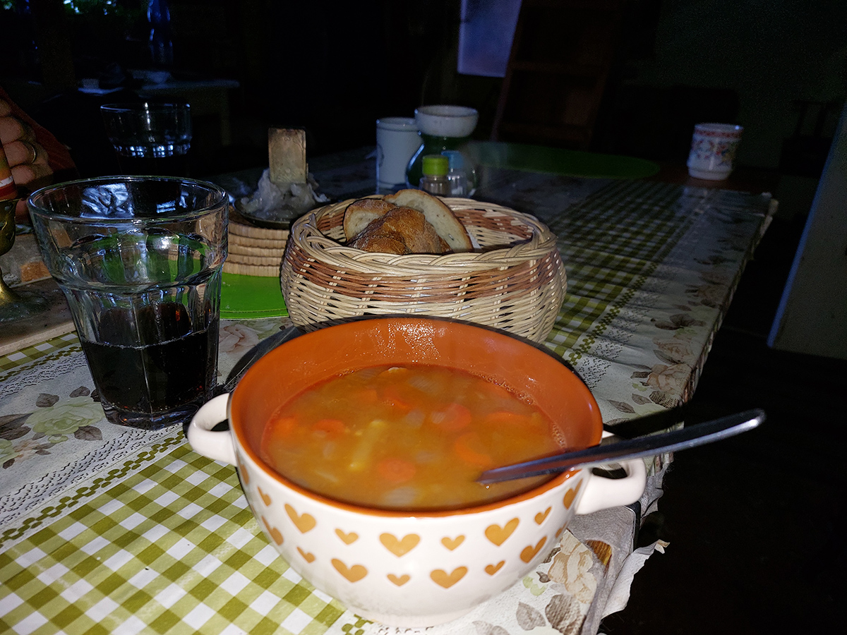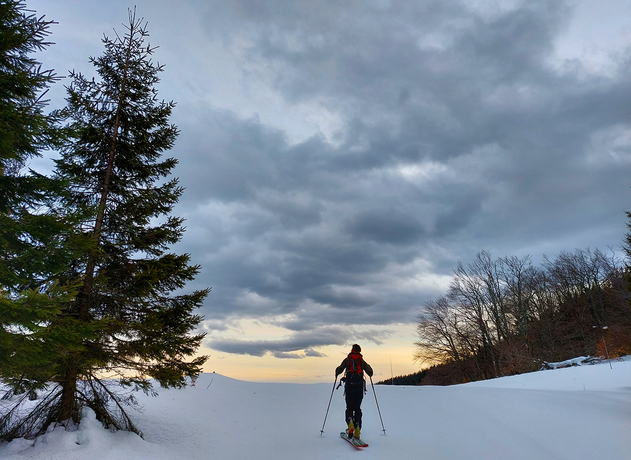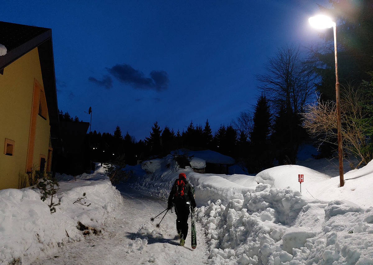 Takže telá z tepla von, pásy do tepla dnu pod bundu a ozaj, na úvod to bola „lyžovačka dňa“ – normálne sa dobre oblúčikovalo pár stoviek metrov. Potom už bolo treba čím ďalej, tým opatrnejšie, už sa to prebáralo, aj viditeľnosť klesala. Záver už za hustnúcej tmy, po vlastnej stope hore lesom nazad na Mistríky a cez lúky krížom k autu. Okolie vysvietené ako na vianoce a automat zapýtal za parkovanie desinu, vydriduch! Ale fajne bolo, asi sme vyťažili z našich biednych možností aj z toho počasia medzi dvoma frontami maximum. Taká pomalá gastroskituristika to bola, najmä popoludní - ale aj to treba niekedy, keď iba hlavy chcú, no telá nevládzu.