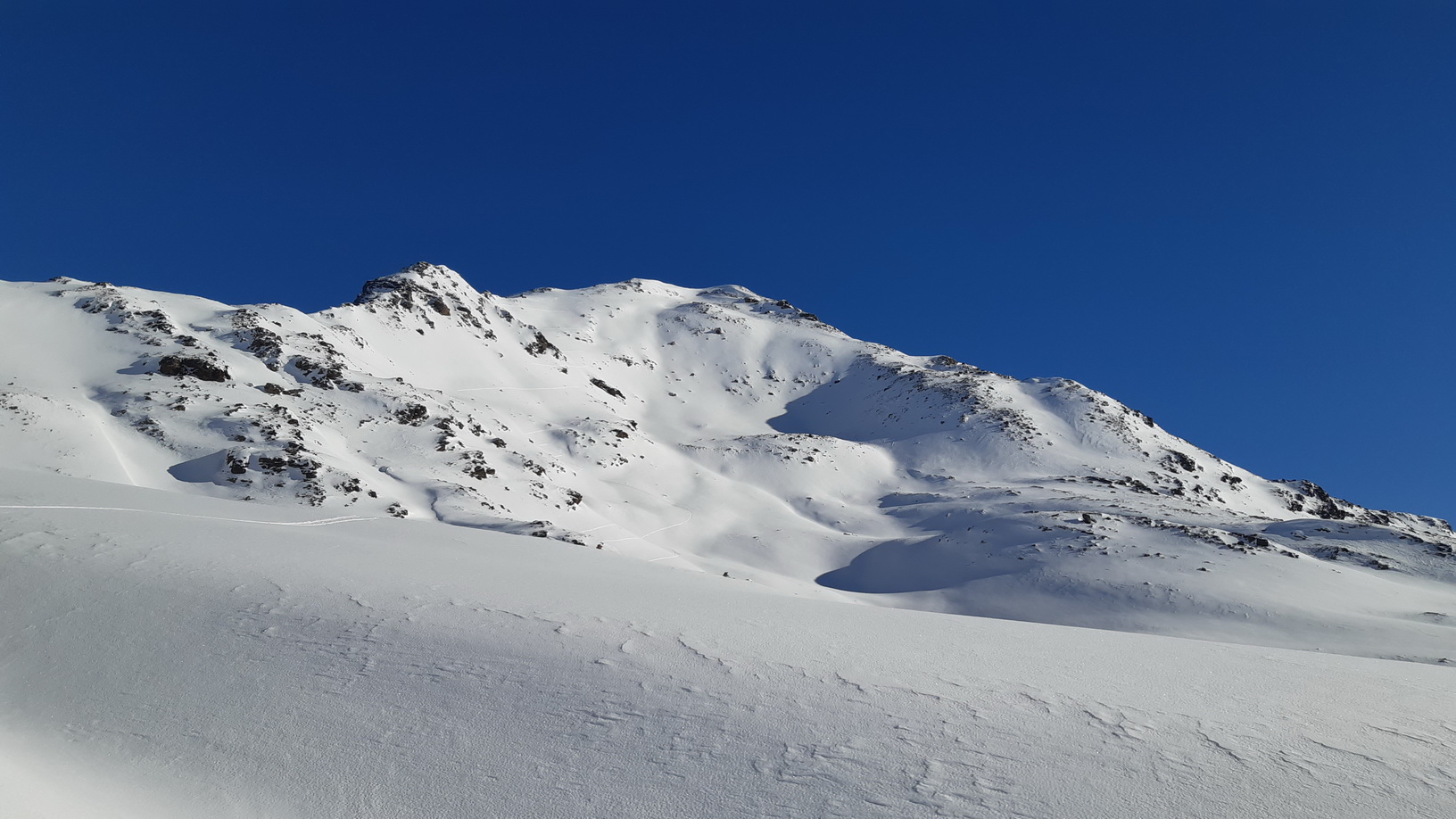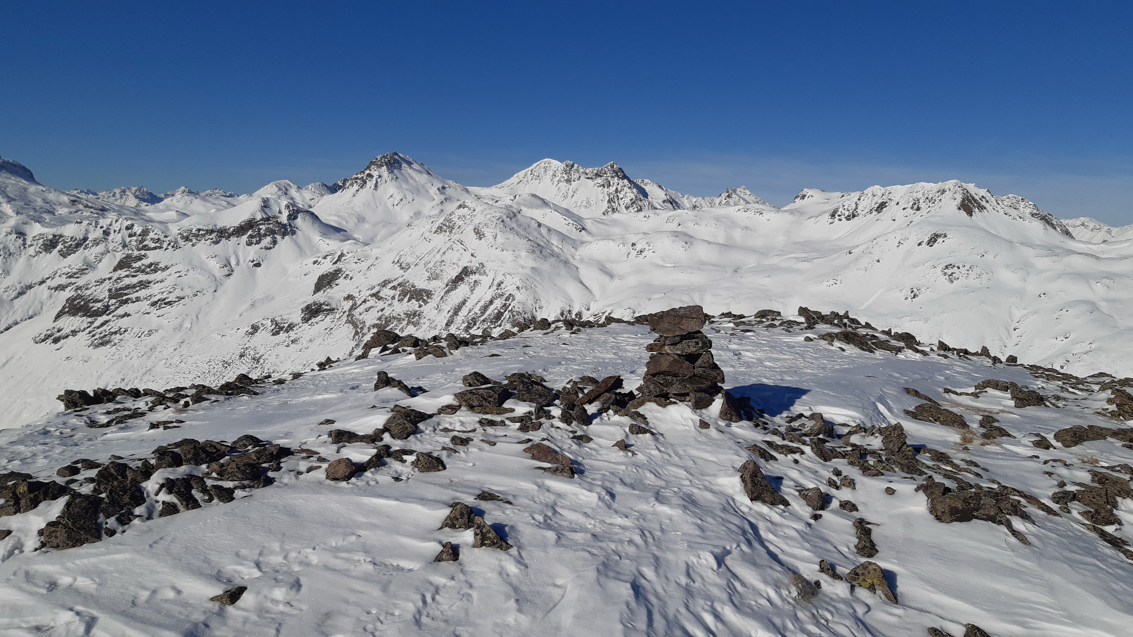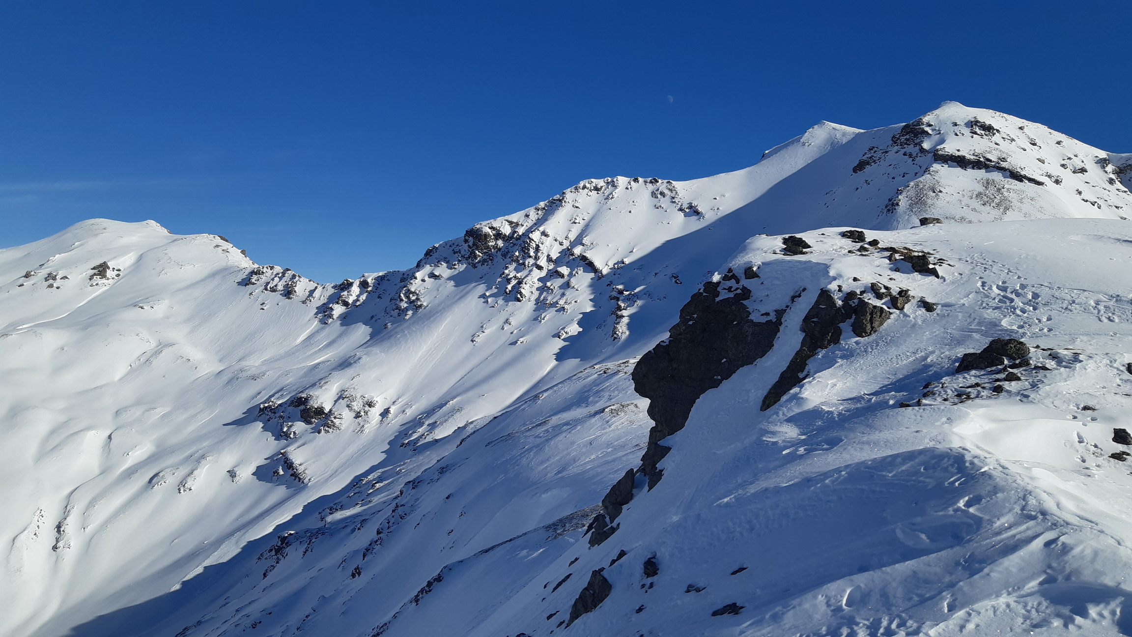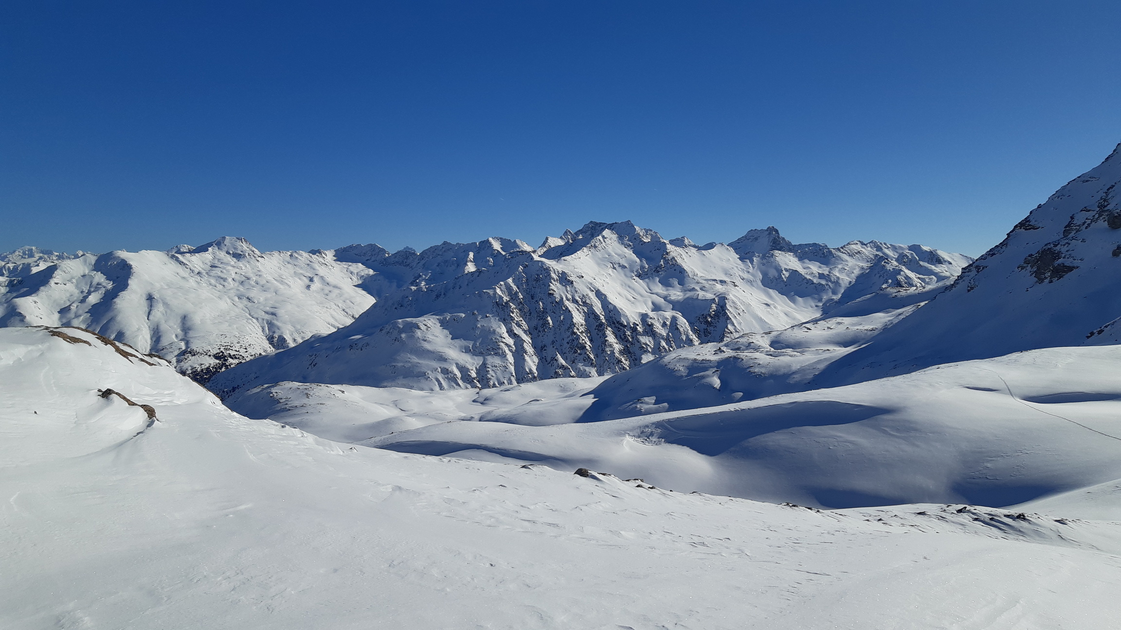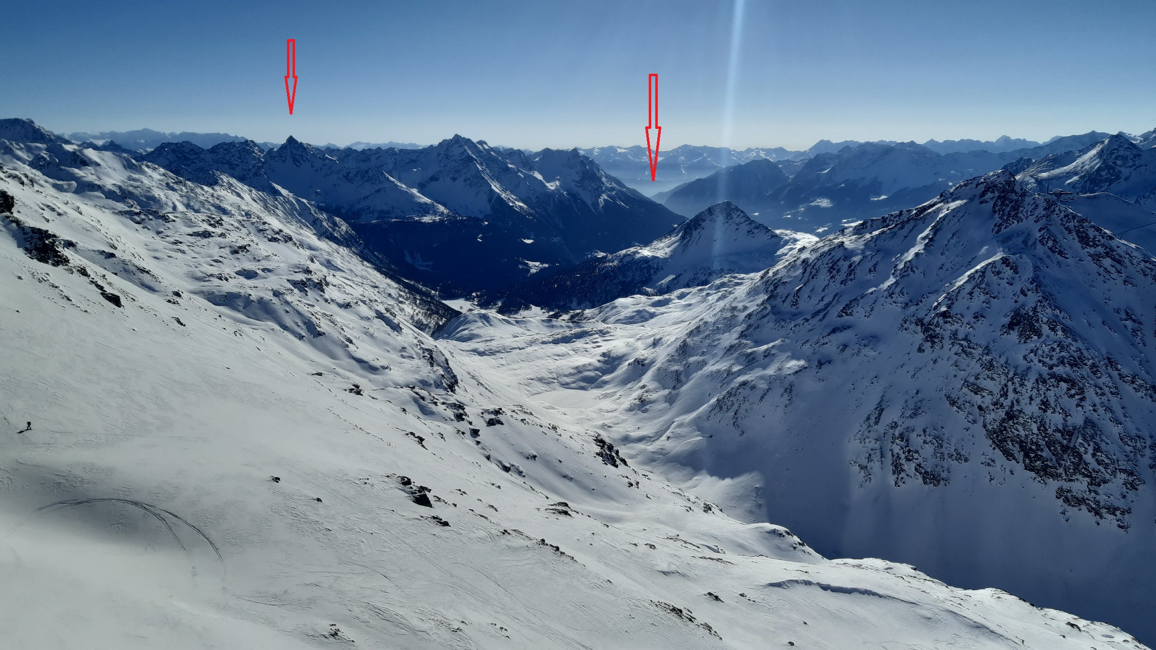 Využijem pomerne dobrú stopu a zanedlho sa už kochám výhľadmi z dominantného hraničného kopca medzi Livignom a Engadinom. Zjazd síce nie je bohviečo a miestami sa trápim v kôre ale za chvíľu už traverzujem údolie nad salašom. Opäť nalepím pásy a ako som si už dopredu naplánoval znovu ma čaká Minor tentoraz východný vrchol.