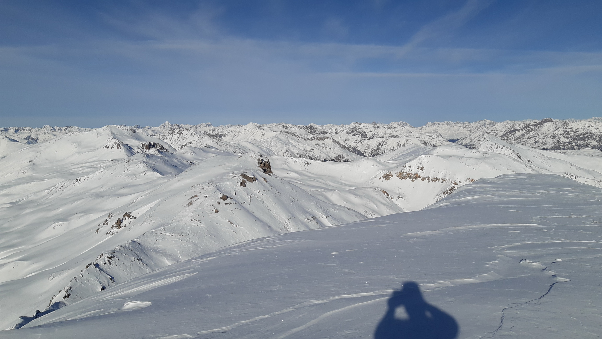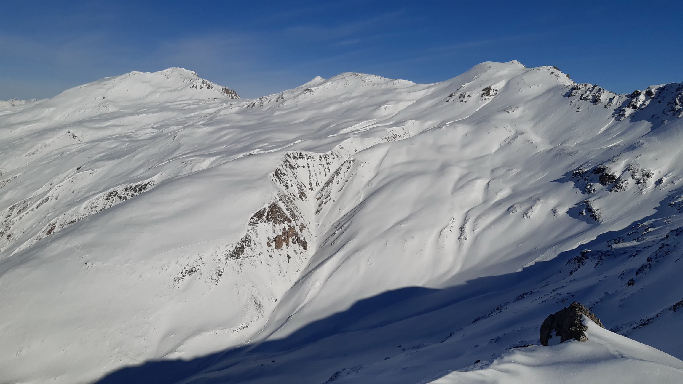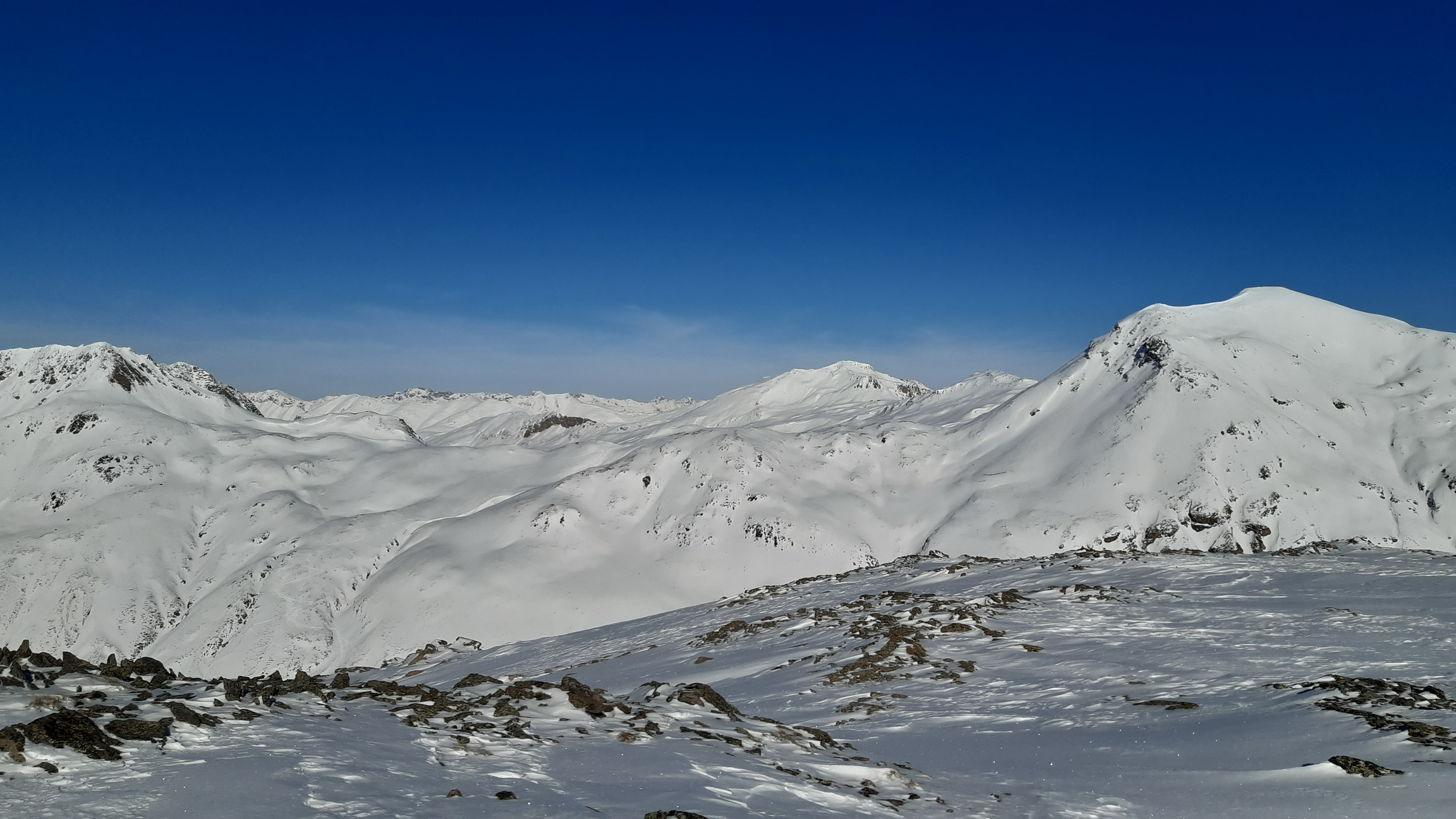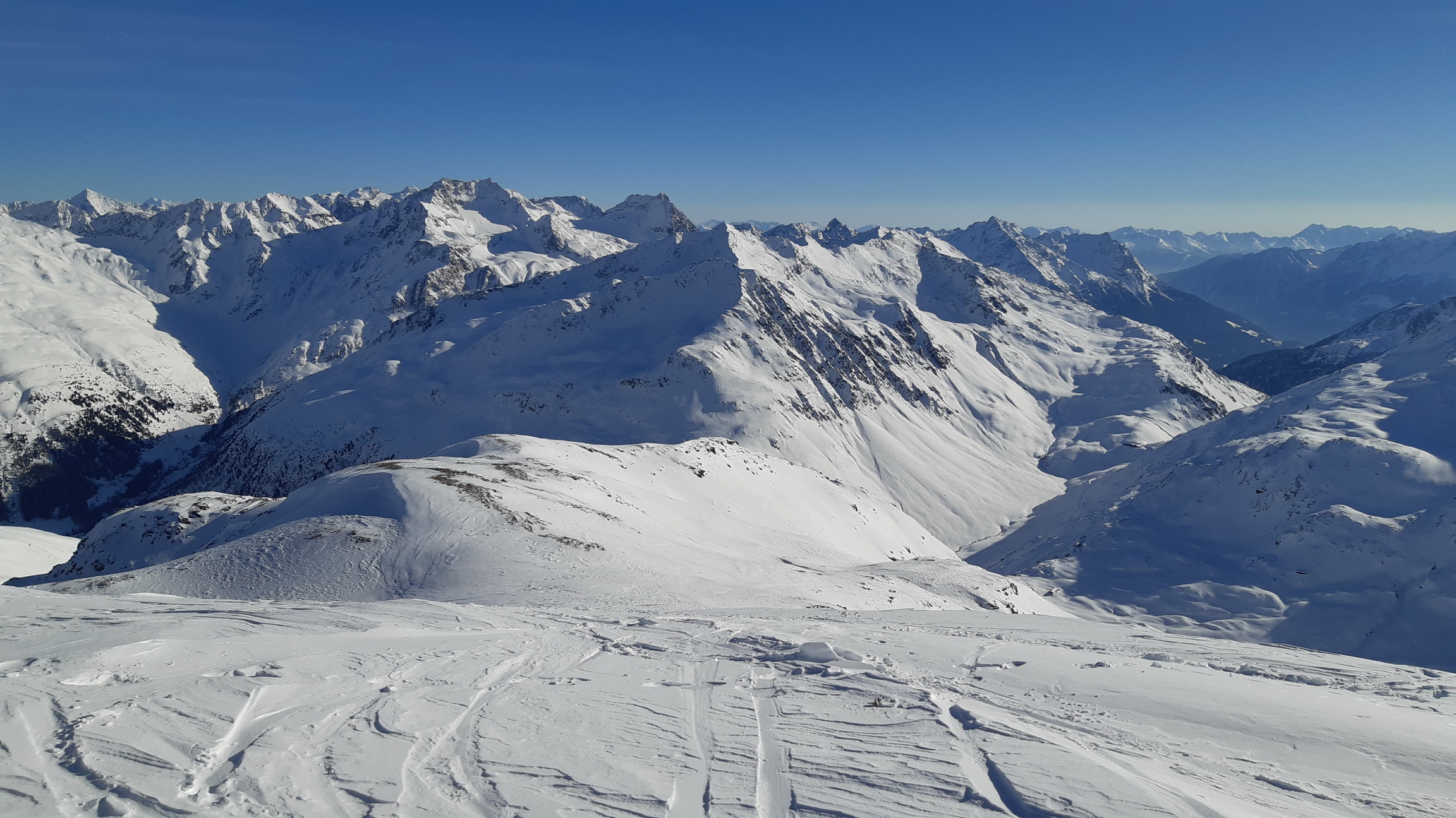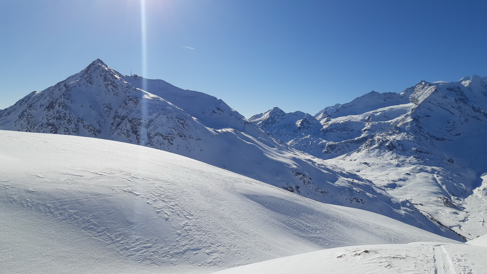 Využijem pomerne dobrú stopu a zanedlho sa už kochám výhľadmi z dominantného hraničného kopca medzi Livignom a Engadinom. Zjazd síce nie je bohviečo a miestami sa trápim v kôre ale za chvíľu už traverzujem údolie nad salašom. Opäť nalepím pásy a ako som si už dopredu naplánoval znovu ma čaká Minor tentoraz východný vrchol.