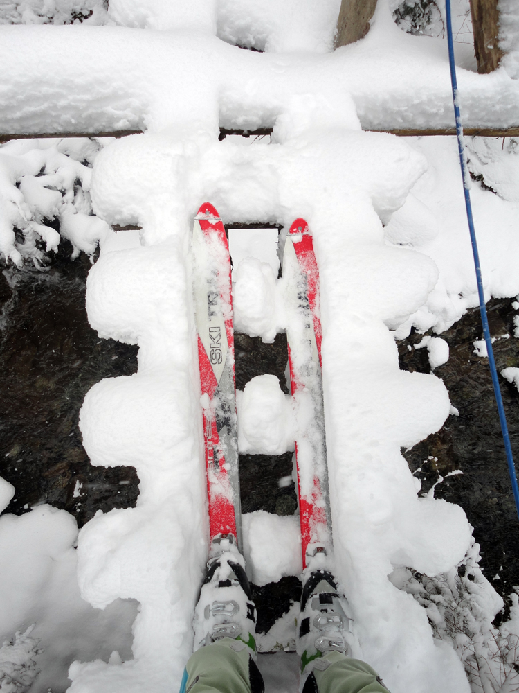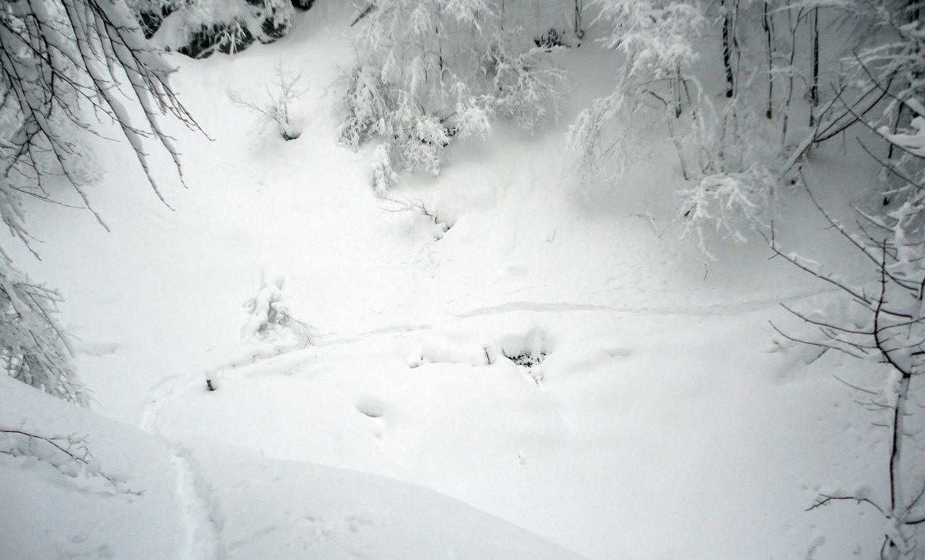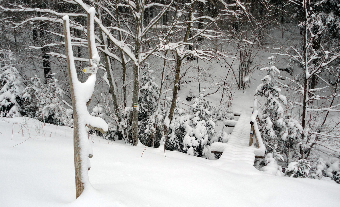 Aj nad Havranovom v lese ešte málo. Cez mostík nad chatou ale idem prvý. Na výšľap to stačí, aj keď spočiatku škrtám o šutre a korene, ale dole by som z Borišova lyžoval najviac ak po zákrutu k potoku. Zato nad ňou je to stále väčší boj so snehom. Rúbanisko aj skratka lesom od kolíb na Košariskách sa veru už pýtajú poorať.