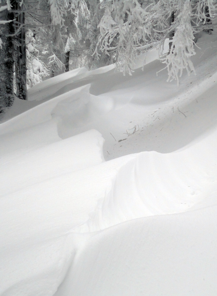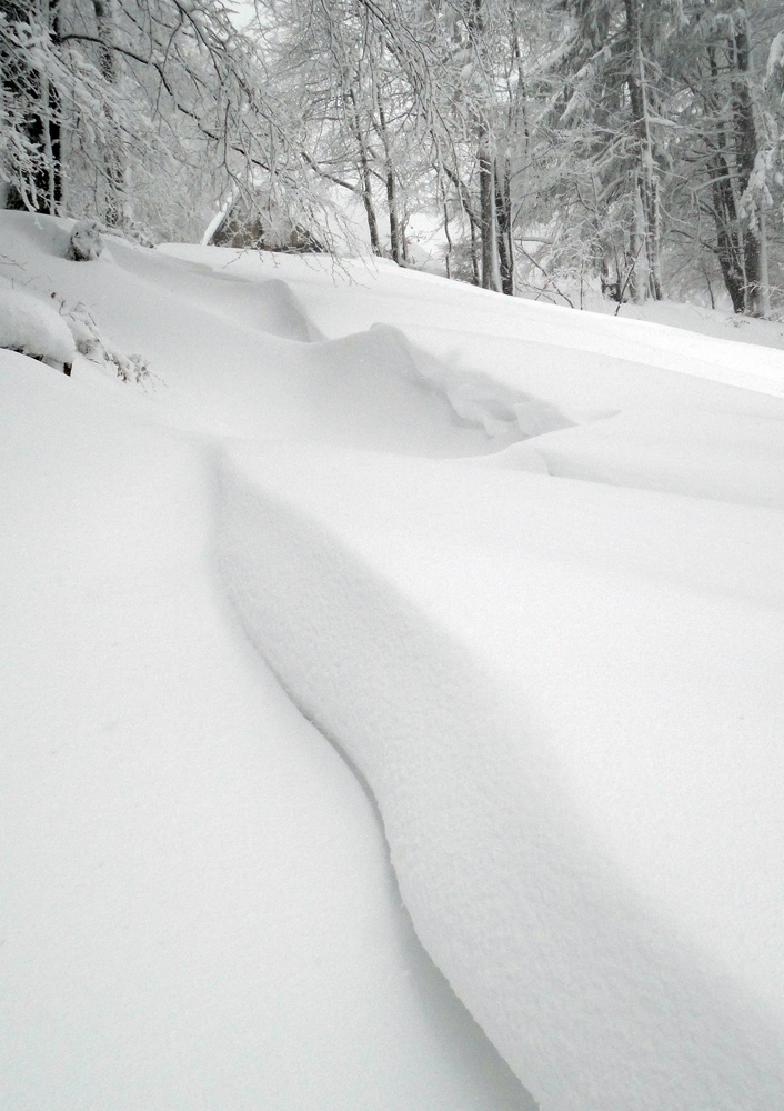 Lúka? Tak po kolená, v pohode :-) Ale ide sa do traverzu Borišova a tam už miestami ide do tuhého. Krásne je tu všetko osnežené, nefúka už veľmi, ale záveje sú teda parádne a stále viac sa treba aj zohýbať. Aj keď nájdu sa aj relatívne pohodové úseky:
