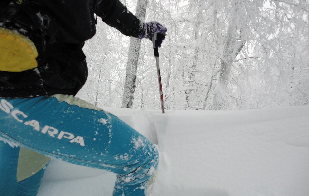 Konečne von z lesa, k chate sa len obzriem, aj tak ju poriadne nevidno. Ide sa na Ploskú. Najprv poriadne hlboká stopa, od chaty natiahnutá, ale potom už len mlieko s víchrom a snežením. Som rád, že vidím od tyče k tyči, ale aspoň tu nehrozia lavíny – vyfučaný celý kopec do starého ľadu.