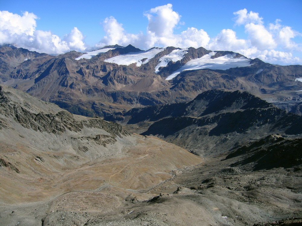 Z vrcholu sú výborné výhľady na všetky strany, ale predovšetkým na masív Ortlera a Konigspitze (Gran Zebru)