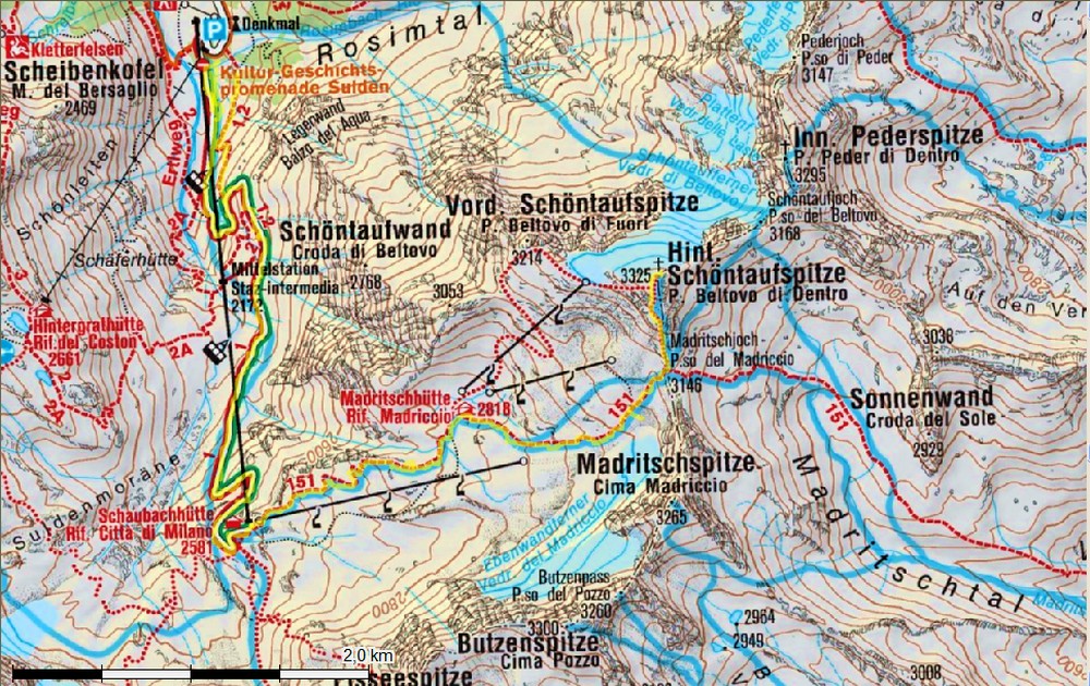 Schontaufspitze je zo Suldenu najľahšie dosiahnuteľná trojtisícovka. Najvyšší bod nad lyžiarskym strediskom Madritsch tvorí vlastne len kopa kamenia, ale poloha a výška ho predurčila na obľúbený vyhliadkový cieľ. Výhľady na všetky strany sú naozaj výborné.