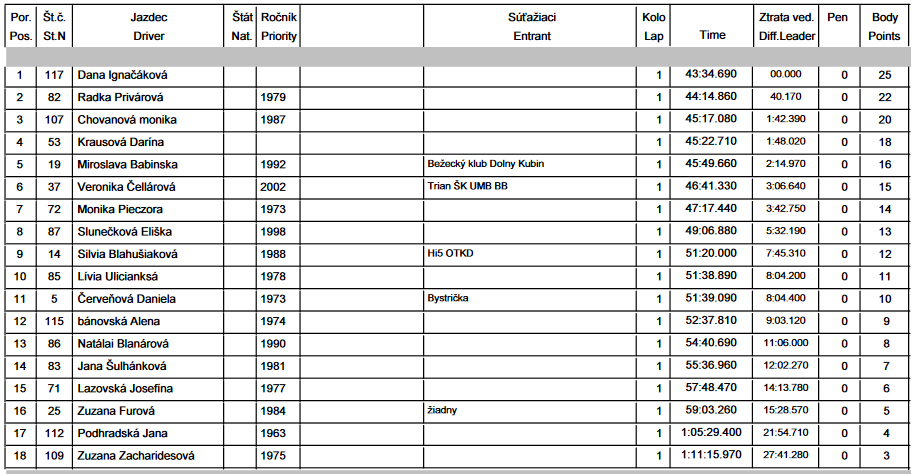 Medzi dievčatami tiež skoro nič nové, skoro samé známe tváre. Nazbieralo sa ich takmer do dvadsiatky. Danka Ignačáková si išla systémom štart – cieľ, ale tu už sa mladšie (kategória E) a krajšie diouky (F) v popredí trochu premiešali a boli potom v cieli aj dáke súboje „o prsia“. Na rozdiel od chlapov, ktorí dobiehali pekne slušne zoradení. Teda aspoň tí úplne vpredu. Podrobnejšie výsledky ako sú v galérii nájdete na stránkach časomiery TU.