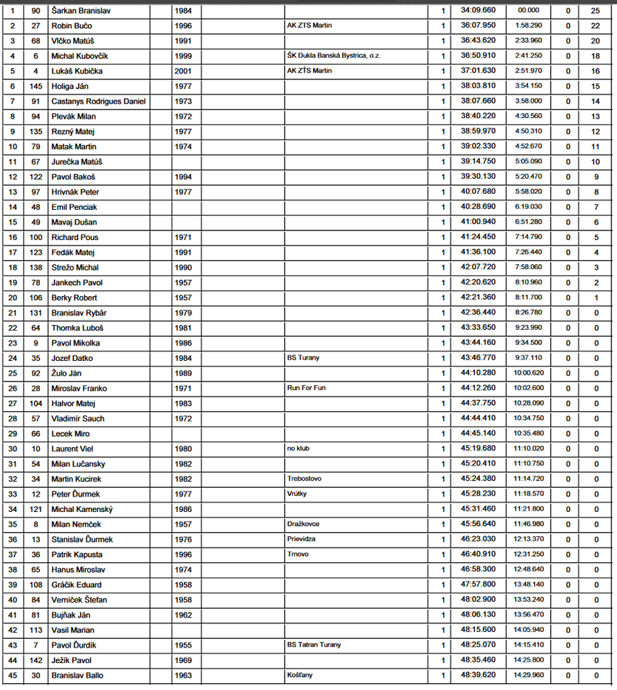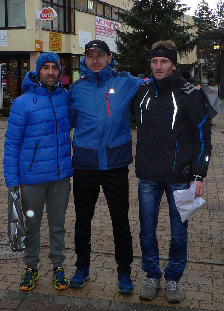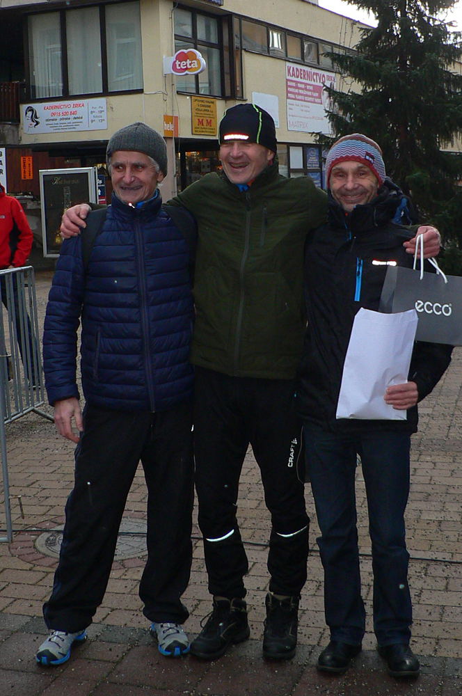 Na veterný úsek pri parku sa trochu posťažoval aj tradičný víťaz posledných ročníkov Braňo Šarkan – vraj si myslel, že ho tam všetci dobehnú, ako ho to zastavilo. Ale čo chce s takým menom, a keď navyše má dokopy 30 kíl aj s maratónkami :-) Zato to rubol za pohodlných 34 minút a jeho prenasledovatelia boli v hoooodne úctivej vzdialenosti za ním. Tentokrát si prvé tri miesta v absolútnom poradí postrážili mlaďasi do 40 rokov, štyridsiatnici (kategória B) pekne za nimi. Zato šesťdesiatnici (D) vymlátili vraj päťdesiatnikov (C). Možno preto z tých mladších „céčkarov“ prišiel na vyhlásenie len jeden, čo sa asi najmenej hanbil :-)))