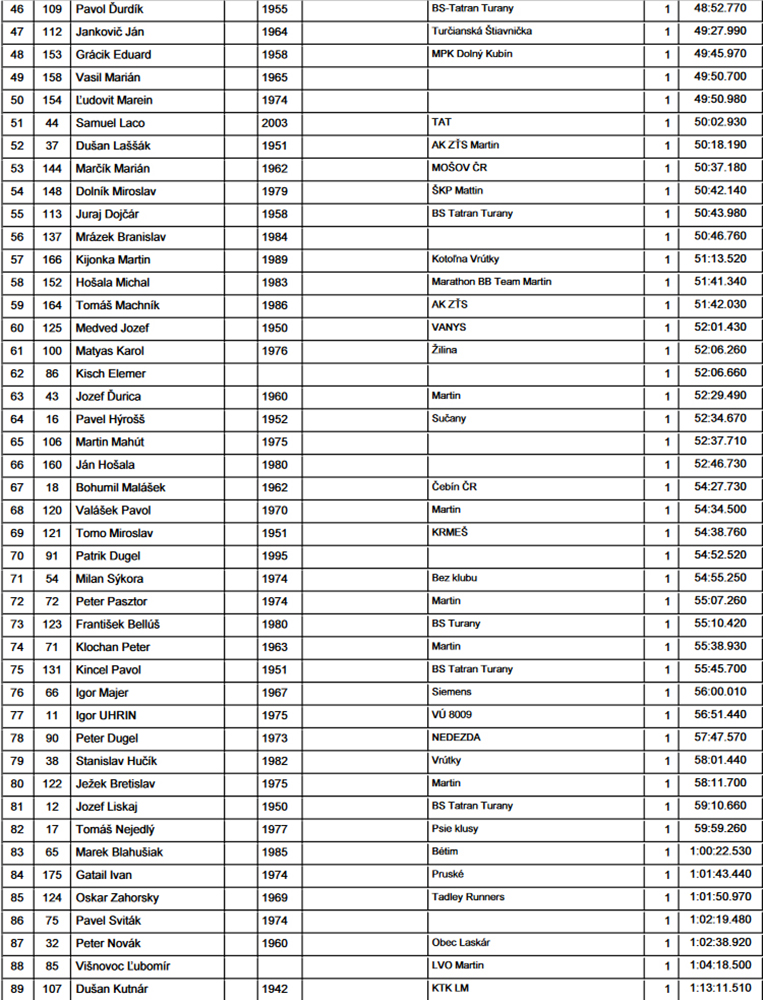 V cieli samozrejme teplý čaj a chladné keksíky do sýtosti a pre každého obložená žemlička. Pre tieto dobroty si prvý dobehol Robin Bučo z MT (za 32:20) a medzi dievčatami tradične Dana Ignačáková, tiež v podstate domáca (43:48). Posledný bežec Dušan Kutnár (ročník 1942) bol zároveň aj najstarší, takže klobúk dole pred jeho výkonom. Pritom vôbec nebolo treba naňho nejako príliš dlho čakať.