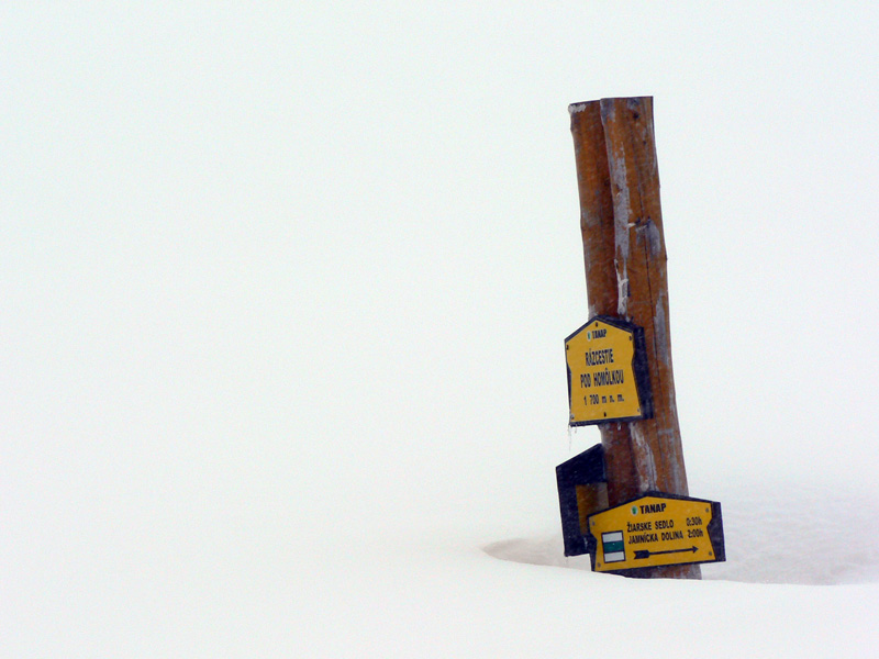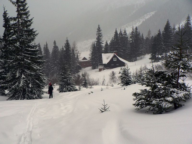 Trojkráľový víkend na horách počasie moc nevyšlo, ale napriek jemnému sneženiu a mrakom, ktoré viseli „proklatě nízko“ sa v nedeľu ráno od parkoviska šinul slušný „vláčik“: pešiaci, bežkári aj šliapači, ani kočík nechýbal v trojkráľovom maškarnom sprievode. Cesta po chatu vyleštená sklznicami, ale čuduj sa svet, vedľa na modrom chodníku len staré zasypané stopy.