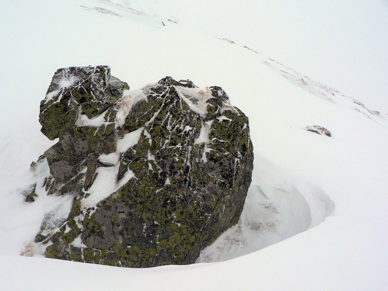 Skúsil som aj výlet do malých Závratov, ale to bolo ako ponor do mlieka. Len sem tam tmavý kameň. A keď sa raz tá hmla trochu zdvihla, z hrebeňa sa vyškierali poriadne preveje. Tak som radšej odtiaľ zmizol a dal som si Žiarske sedlo od chaty ešte raz. Popoludní už mrak trošku zredol, alebo som si zvykol :-) Aj stopa prešliapnutá, aj ju vidieť bolo, len nad rázcestím Pod Homôľkou rozlyžovaná. Ale cestou nazad k chate som si užil aj frírajd popod vlek – asi 6 oblúkov :-)