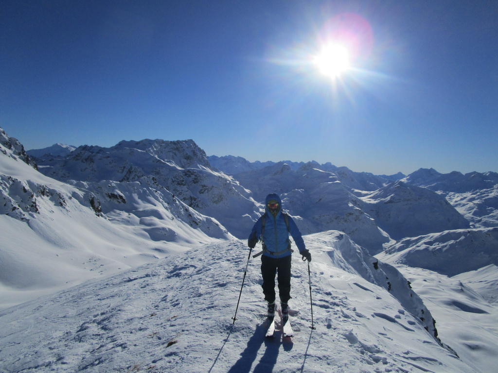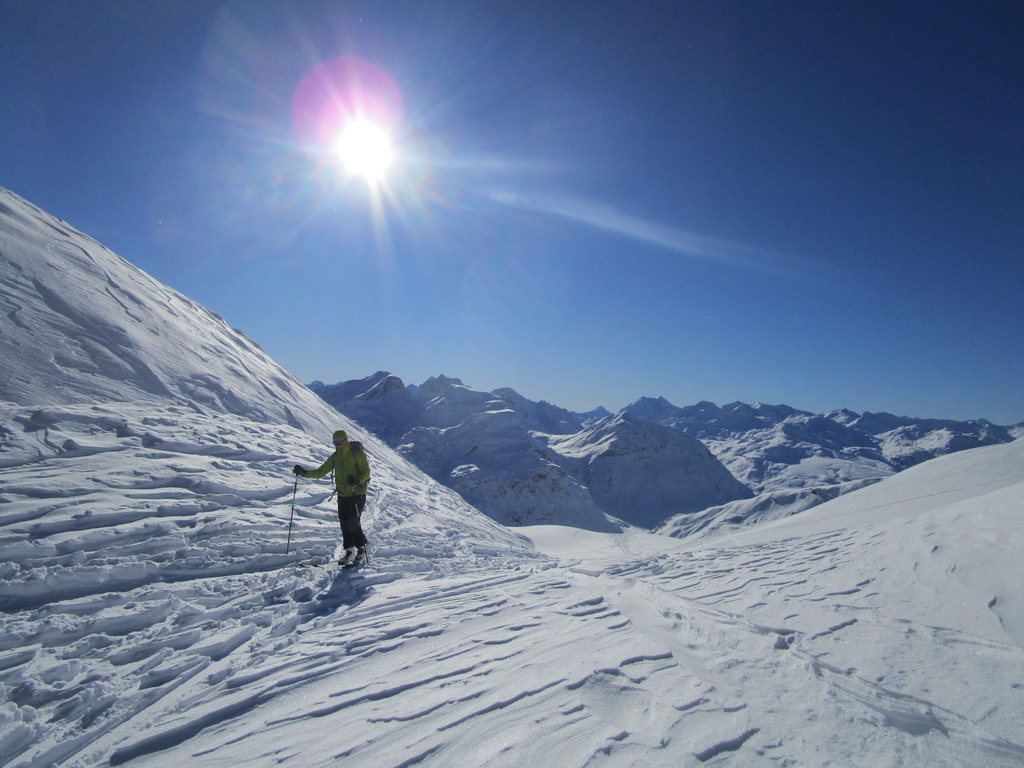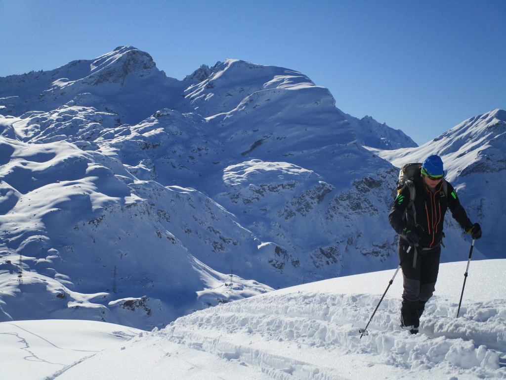 Na vrchol nám to trvá pohodovým tempom dve hodiny. Približne 600 výškových metrov s ideálnym stúpaním. Parádne sa bude lyžovať dole. Dôležité na tejto túre je, že poobede sme celý čas na slnku. Ráno bolo totiž v St.Moritzi -20 stupňov.