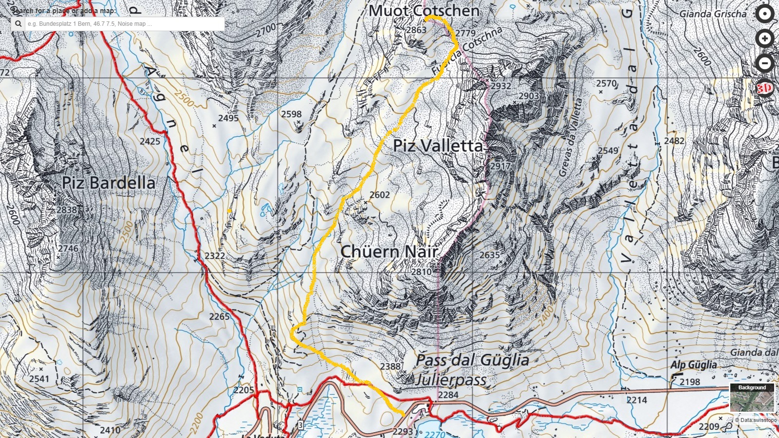Od parkoviska to ale netrvá dlho a sme napojení na prešliapanej autostráde. Tadiaľto sa šliape aj na Surgondu v pozadí. My dnes ideme na menší kopček rovno oproti Piz Valletta s názvom Muot Cotschen. V preklade niečo ako červený hrebeň.