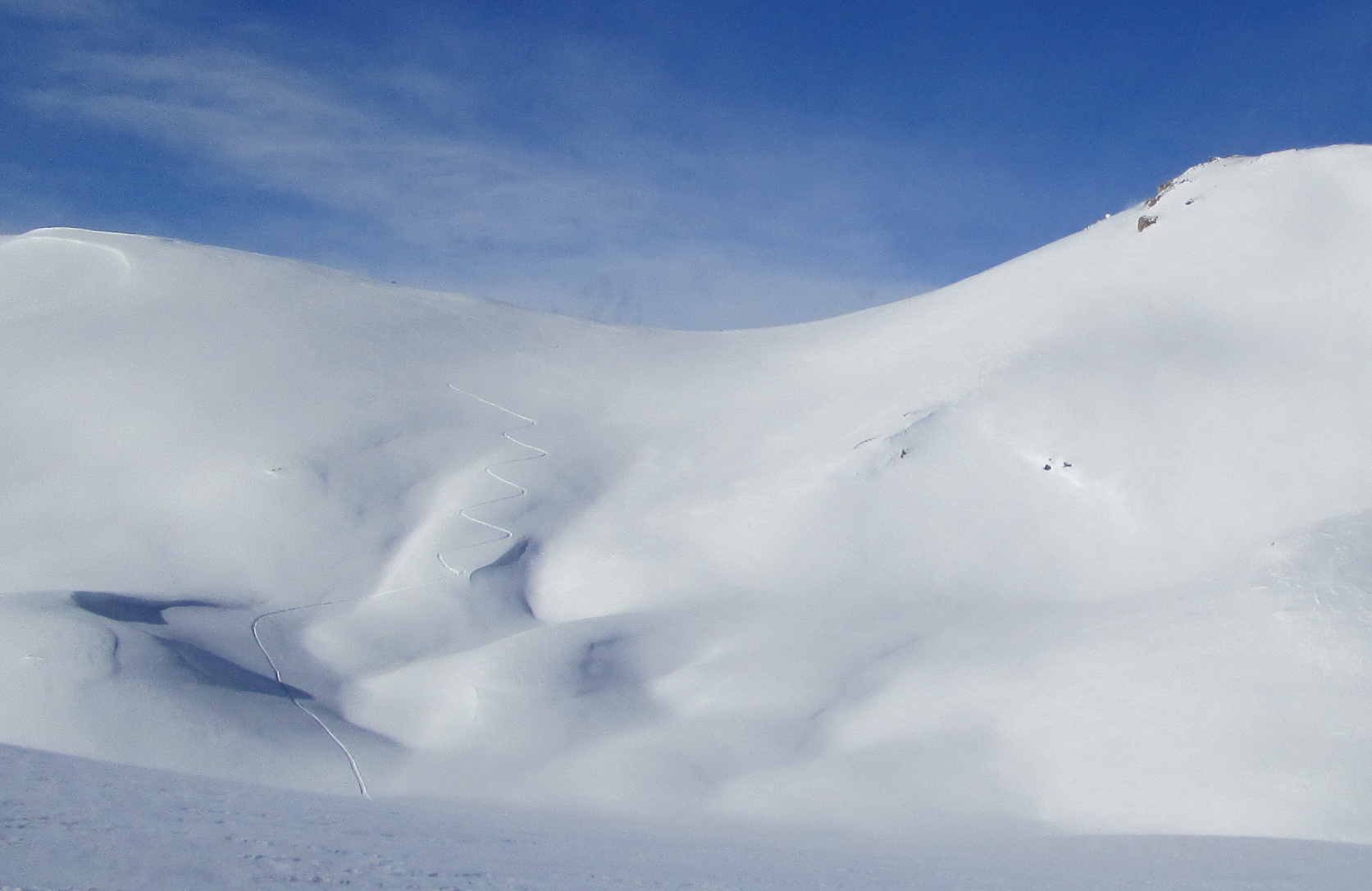 Zlyžujem dole popri mojej výstupovej trase. V závere si aj tak dávam variantu ktorú som ešte nikdy nelyžoval. Teraz tu sú ale prvý krát stopy za posledných 5 rokov a to nemôžem nevyužiť. V doline znovu nalepím pásy a tentoraz už musím prešlapávať stopu. Smerujem do žľabu ktorý som si pred chvíľou obzeral zhora, tentoraz ho skúsim zdola. Asi v polovici sa opäť rozhodujem otočiť. Zjazdujem popri výšlapovej stope v premenlivých snehových podmienkach. Každých pár metrov niečo iné.