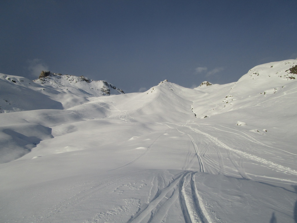 Podmienky sú na december výborné a ja vyrážam od auta ktoré parkuje na zátačke nad hospicom. Prehupnem sa cez briežok a zjazdujem na pásoch kúsok do ústia doliny val dAgnel. Dolinou si to prášim hore po luxusnej stope. Až počas šlapania si v hlave dávam dokopy plán na dnešnú túru. Hodín mám iba zopár. Žiadny celý deň to nebude. Na rovinke pod Campagnungom odbočujem na stopu vľavo. Po nej sa dostanem na Vrchol Crappa de Toci. Ešte nikdy som tu nebol. Vychutnávam výhľady a fotím pre mňa nové uhly na už známe kopce.