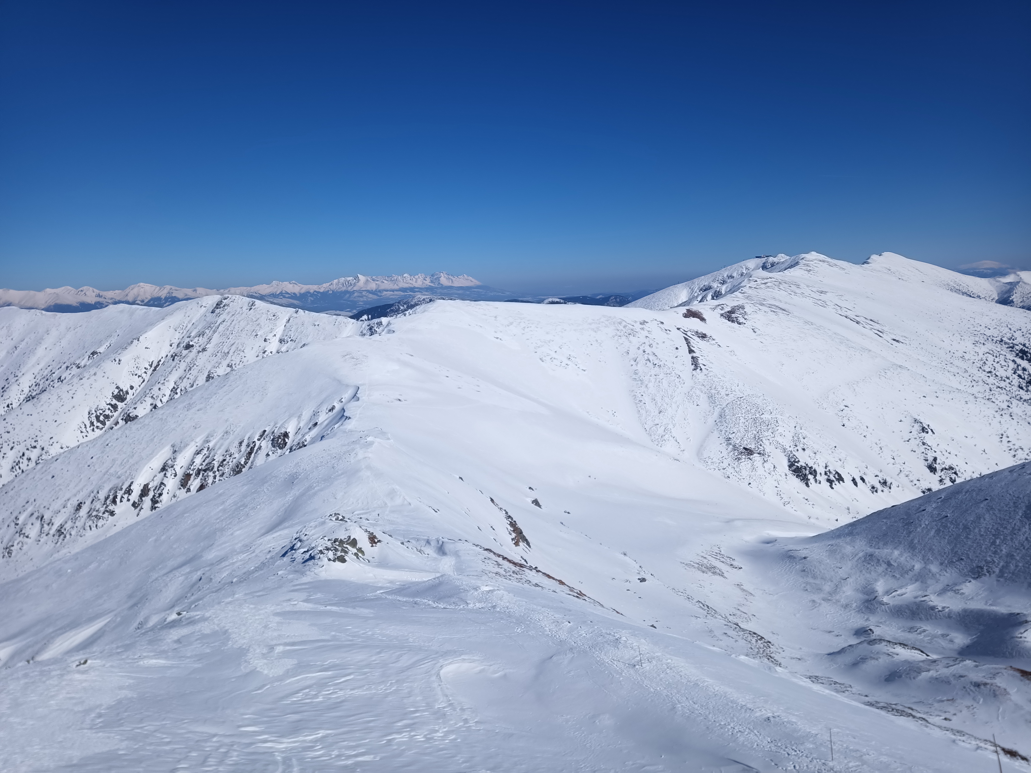Na chate konečne teplá polievka, teplý čaj a veľká káva. Obúvam suché ponožky, trochu sa ponaťahujem a vyrážam smer Ďumbier. Ľudí tu vzhľadom na pondelok nie je veľa, ale po západnej časti hrebeňa je to aj tak sociálny šok. Na vrchole sa nezdržiavam, pokochám sa výhľadmi, strhávam pásy a lyžujem smer Demänovské sedlo. Sneh je tu zmrznutý, rozbity, kde tu trčí kameň. Lyžovačka veru dnes nie je veľmi o užívaní si. V sedle lepím pásy a pokračujem smer Chopok. Na Chopku len prefrčím okolo hornej stanice lanovky a púšťam to pod Dereše. Z Derešov krásnym hrebeňom pohodovo na Poľanu a konečne opäť v kľude bez ľudí. Až na ten vietor, ktorý ešte výrazne zosilnel, zalieza už takmer všade a ja začínam byť dosť premrznutý. Rozhodne to nepridáva na pohode. Hrebeň ďalej pokračuje krásnym úsekom cez Kotliská. Opäť rýchlo striedam výšľapy na pásoch a lyžovanie. Pod krátkym, ale výživným výstupom na Chebenec sa mi darí nájsť kúsok závetria za skalou, tak oddychujem. Totálne premrznutý a vyfúkaný volám manželke, na Popradskom plese vraj počasie na krátke tričko. No super. V telefóne mi hovorí, že z Chabenca to už nemám ďaleko a ja som jej naivne uveril – sladká nevedomosť. Posilnený touto info cikcakujem na Chabenec.