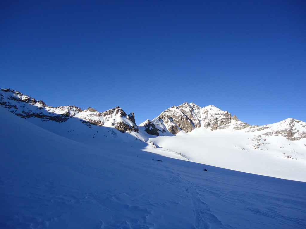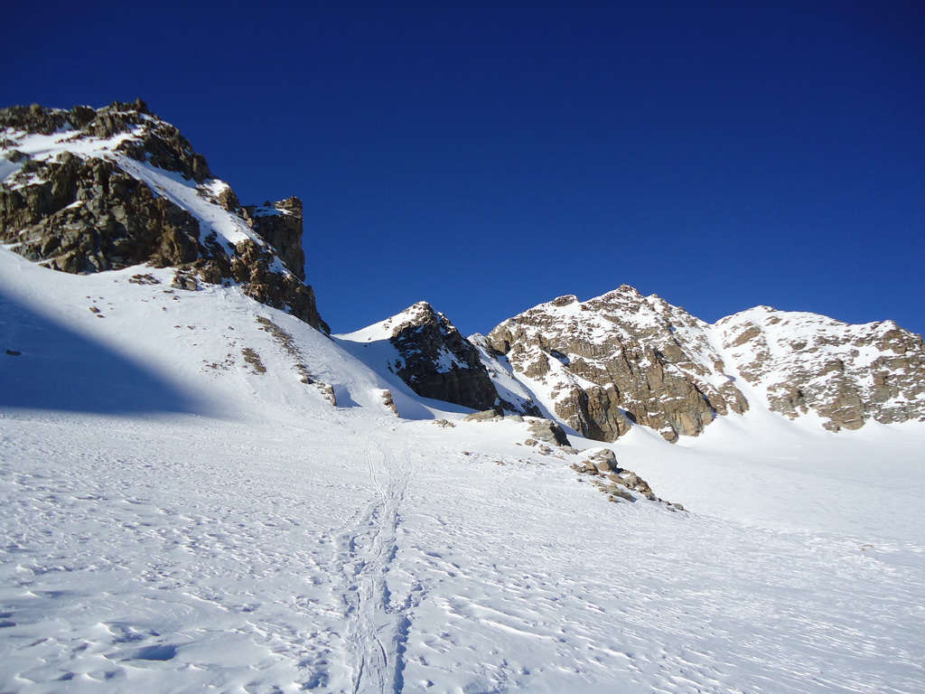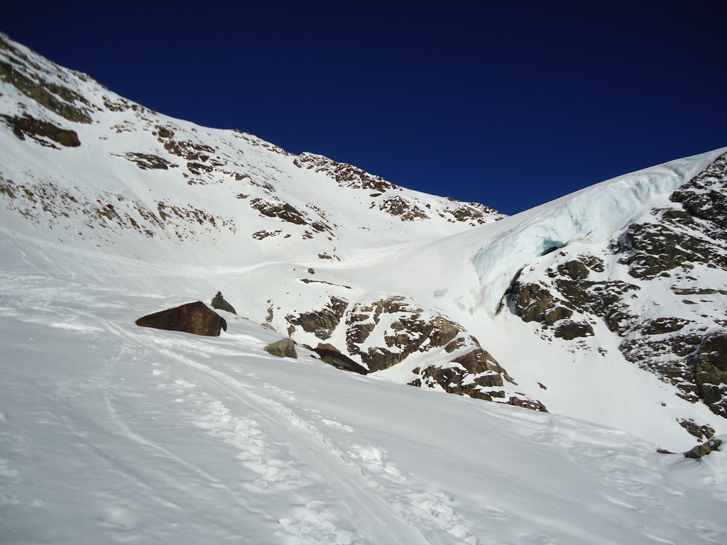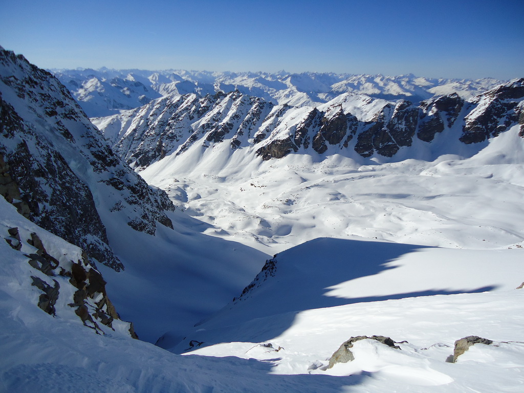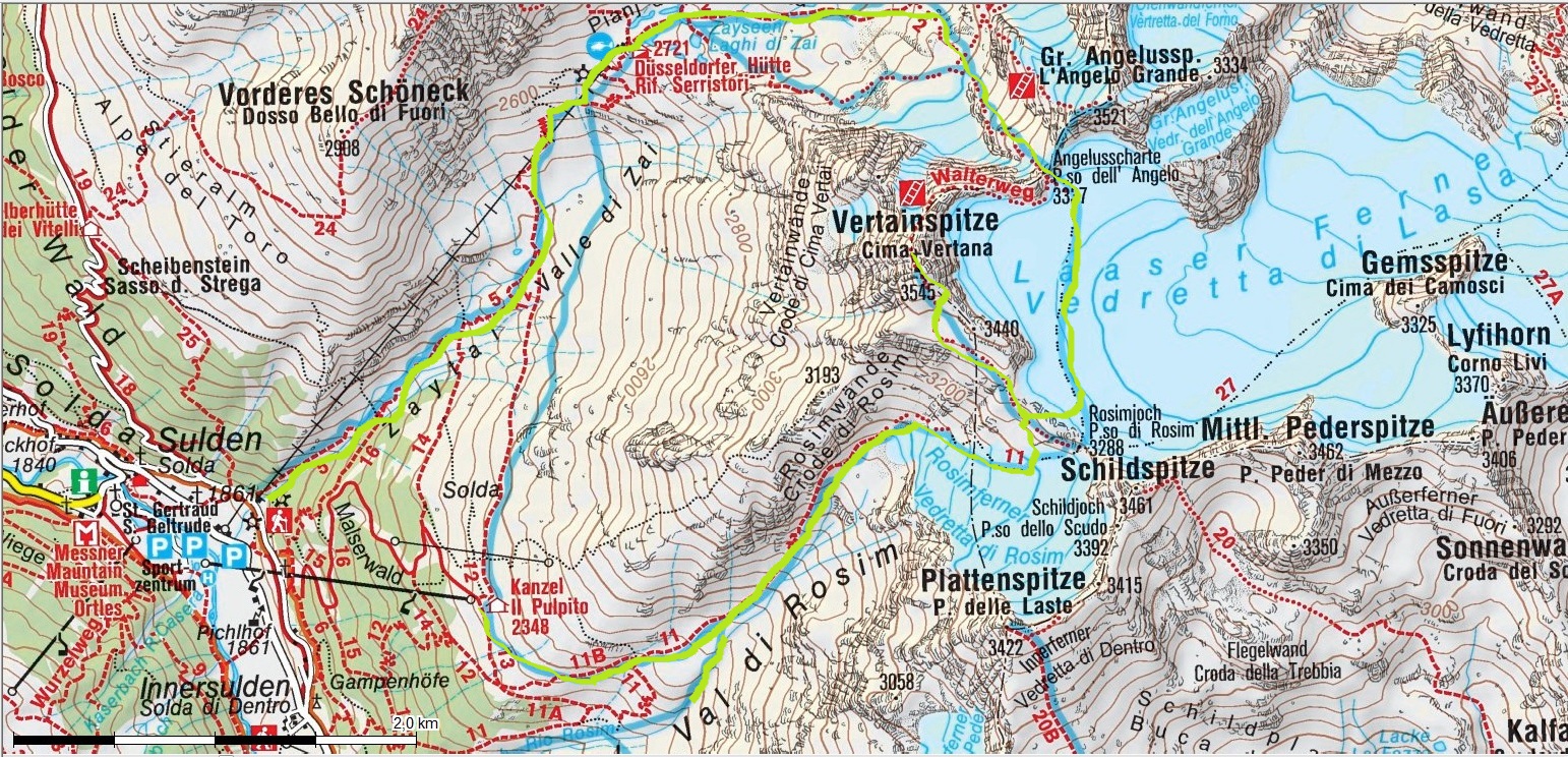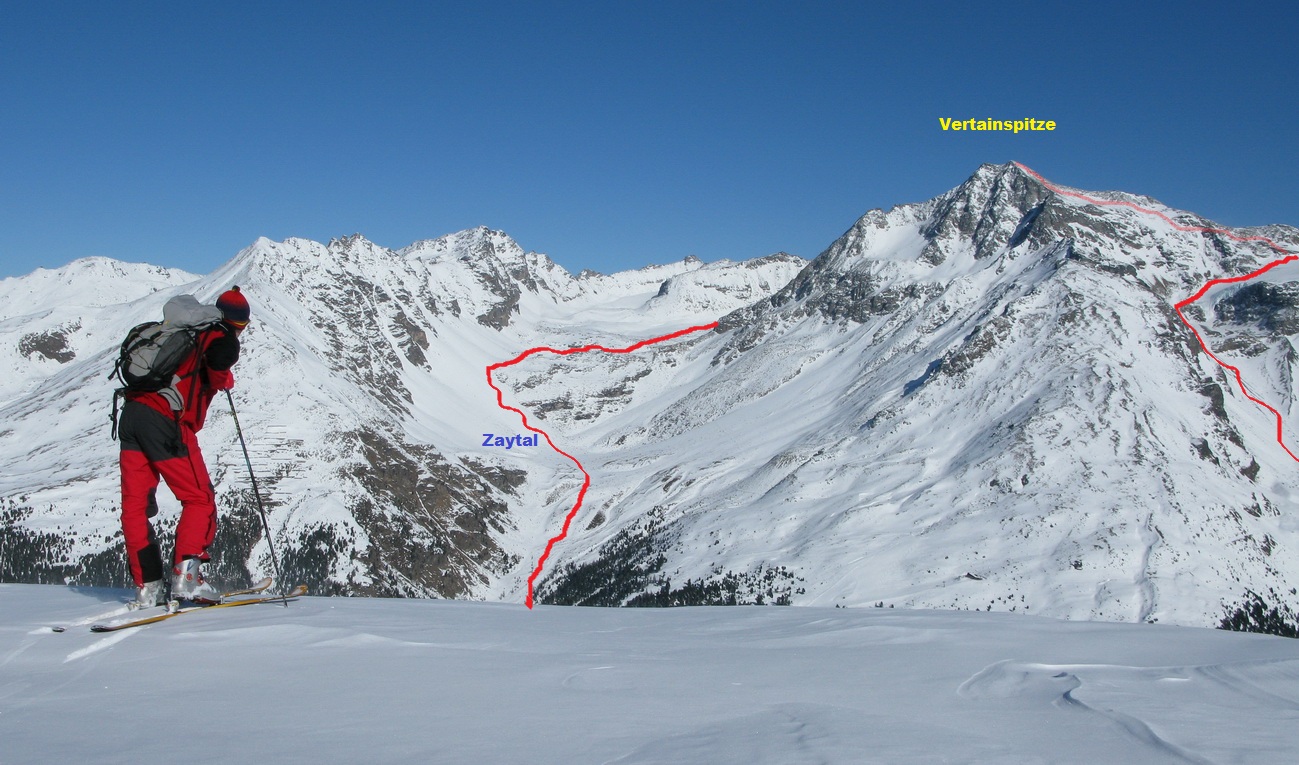 Minulú zimu som však využil mimoriadne snehové podmienky a spravil som okruh okolo Vertainspitze. Zo Suldenu treba vystúpať dolinou Zaytal ku Dusseldorfer hutte (v zime mimo prevádzky), odtiaľ je kľúčovým miestom celej túry výšľap do Angelusscharte. V prípade dobrých snehových podmienok sa dá vyšliapať na pásoch až do sedla úbočím vľavo. Pozor! často tu padajú lavíny.