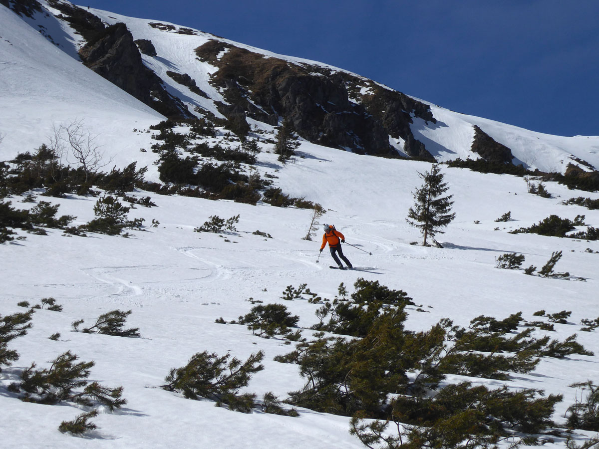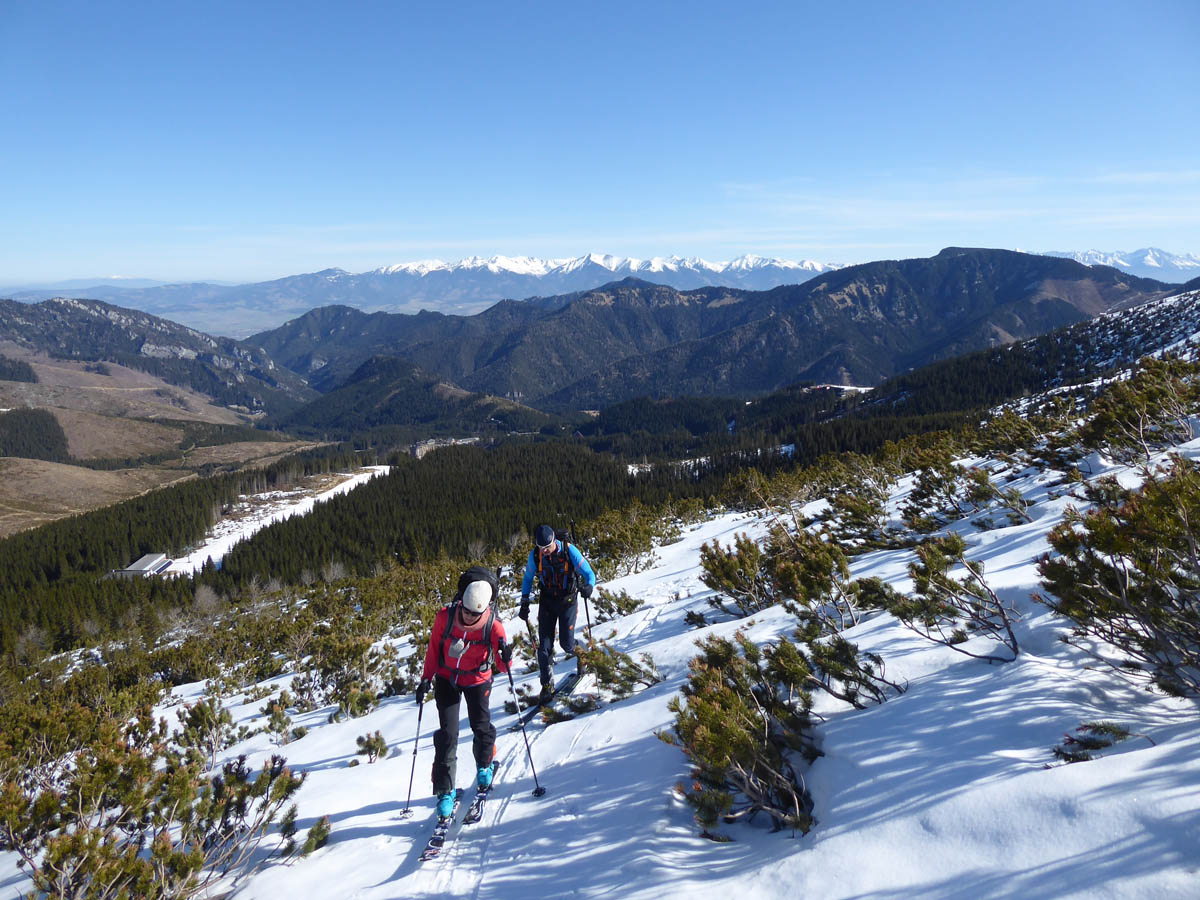 Štartujeme na Brhliskách v slnečnom počasí a pri nejakých mínus dva – úplný ideál.S naberajúcou výškou pri odbočke starého vleku v smere do lesíka je aj nový sneh,ktorý dáva o sebe vedieť pri zmene teploty vytváraním papúč na lyžiach.Takže skladáme a usilovne voskujeme.Zopár traverzíkov a ideme do mačiek,už je tvrdo,expozícia sa stupňuje,naväzujeme sa.Pri výšľape obzeráme vľavo známe frírajdové zóny,ktoré veru tak rýchlo neodmäknú a viac vpravo potencionálne našu dnešnú zjazdovku.Čelom vzad a počas celého dňa Vysoké, Západné aj Babia hora a Pilsko.
