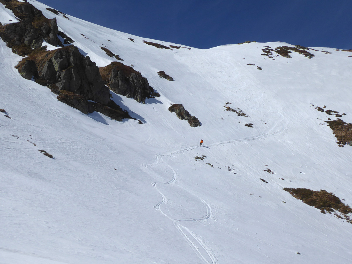 Užívame deň.Slniečko naberá na sile,ale sem tam vetrík nedovoľuje ísť do prvej vrstvy oblečenia.Sme hore,ešte kúštik na vrcholček Dereša a pokračujeme stále na mačkách k nášmu zjazdu.Na mačkách,lebo juhy sú odtopené,cestička vedie priamo vrchom hrebeňa s prevažujúcim sklonom do severných žľabov,takže pásovačku sme vylúčili.Sem tam by sme aj tak prenášali a deň je dlhý,takže načo ťahať tigra za fúzy.