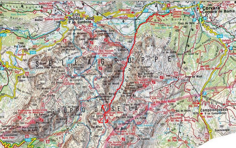 Celá horská skupina je obohnaná prstencom lanoviek a sedačiek (Sellaronda). Každú zimu sa tu koná skialpový nočný maratón po zjazdovkách s prevýšením takmer 4000m. Dolinou Val Mezdi sa dokonca organizujú freeridové preteky. Štart je pri chate a cieľ niekde dole - sadomaso.
