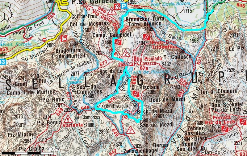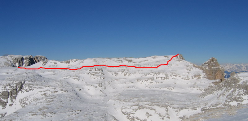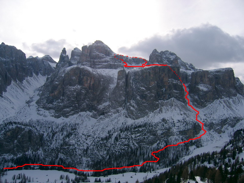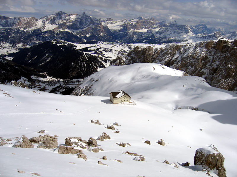 Také pekné miesto na lyžovačku sa hneď tak nevidí, dá sa ísť takmer všade. Som tu prvý raz a tak som zvolil pomerne ľahký okruh: Vystúpal som do sedla Pisciadú, odtiaľ po náhornej plošine až na vrchol Sas de Mezdi (2980m). Zlyžoval som naspäť do dolinky ku chate a potom naspäť cez Val Setus. Do Corvary som sa potom spustil pohodlne po zjazdovke. Večer som nad sporákom prešlapoval z nohy na nohu. Po takomto "výlete" mi to trvalo vždy pár dní, kým som sa dal dokopy.