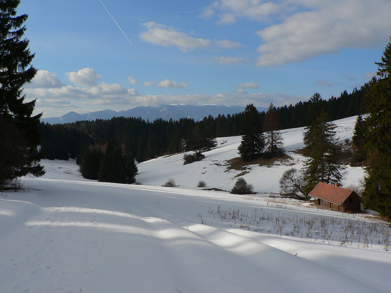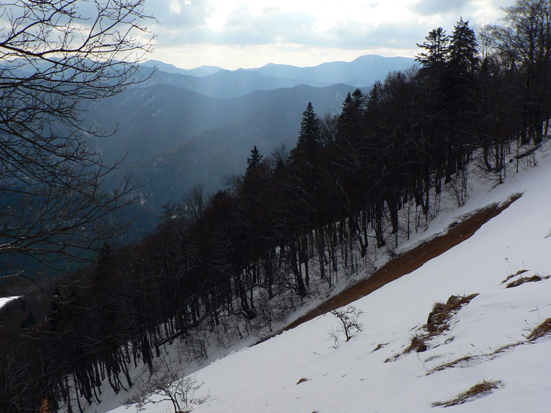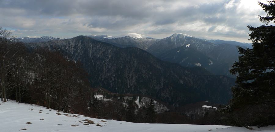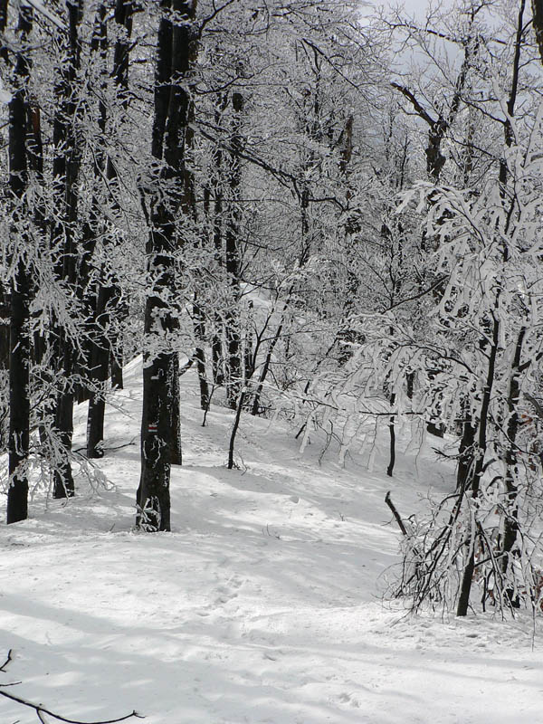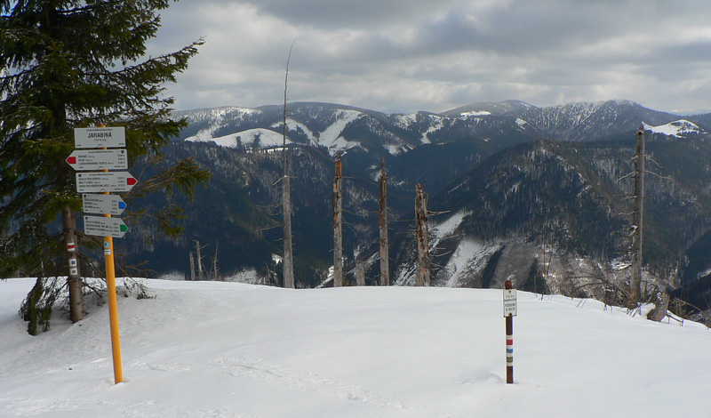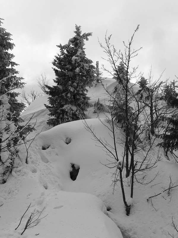 Ako nazvať "severozápadný" hrebeň Veľkej Fatry? Jednoducho ten úsek, ktorý od Borišova na sever vedie cez Malý Lysec, Jarabinú a Kľak a končí na Kope nad Kraľovanmi. Kvôli minimálnym výhľadom a zarastenému chodníku nie je ani v lete veľmi obľúbený. V zime sú ďalšou komplikáciou pre šliapačov krátke a strmé svahy. Takže najlepšie je to asi na snežniciach (veď aj stôp po nich bolo hojne). Na pásoch sa dosť ťažko kľučkuje smerom hore ak je strmo, smerom dole ešte horšie. Ale skúsiť treba, tak som skúsil, keď vo vyšších kopcoch otravovali mraky a severák. Tu bol príjemný, do chrbta, lebo som to šiel opačne (ale len po Malý Lysec).