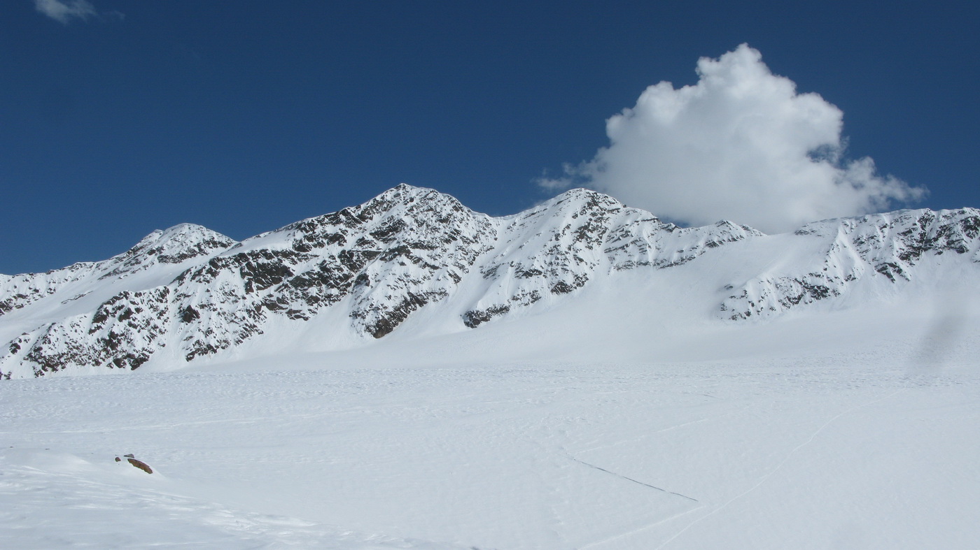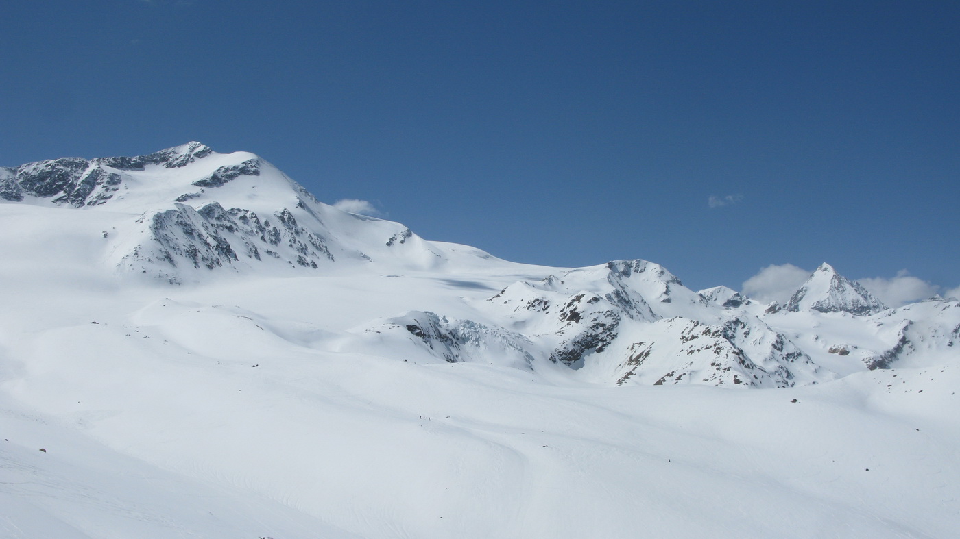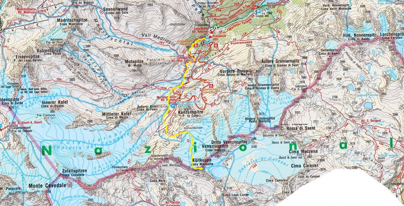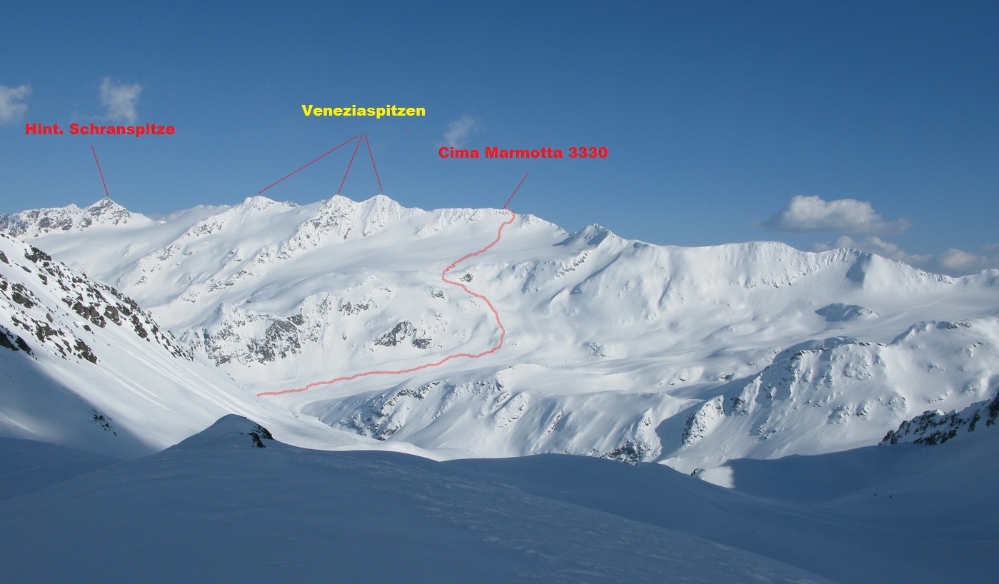Jedna z hlavných túr od Zufallhutte je výšľap na vrchol Cima Marmotta 3330m. Je to pomerne ľahká túra do masívu vľavo od chaty, pri pohľade smerom na Zufallspitze. Marmotta je nevýrazný vrchol v hrebeni, v ktorom kraľujú tri Veneziaspitze. Nám sa nakoniec podarilo v podvečerných hodinách vystúpiť na vrchol. Boli sme tam už sami. Poslednú dvojicu sme stretli na ľadovcovom plató pod vrcholom, ako lyžujú dole.