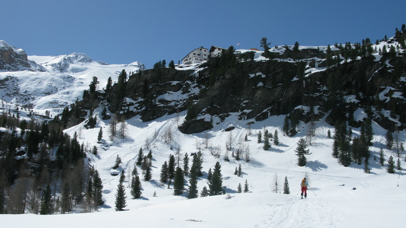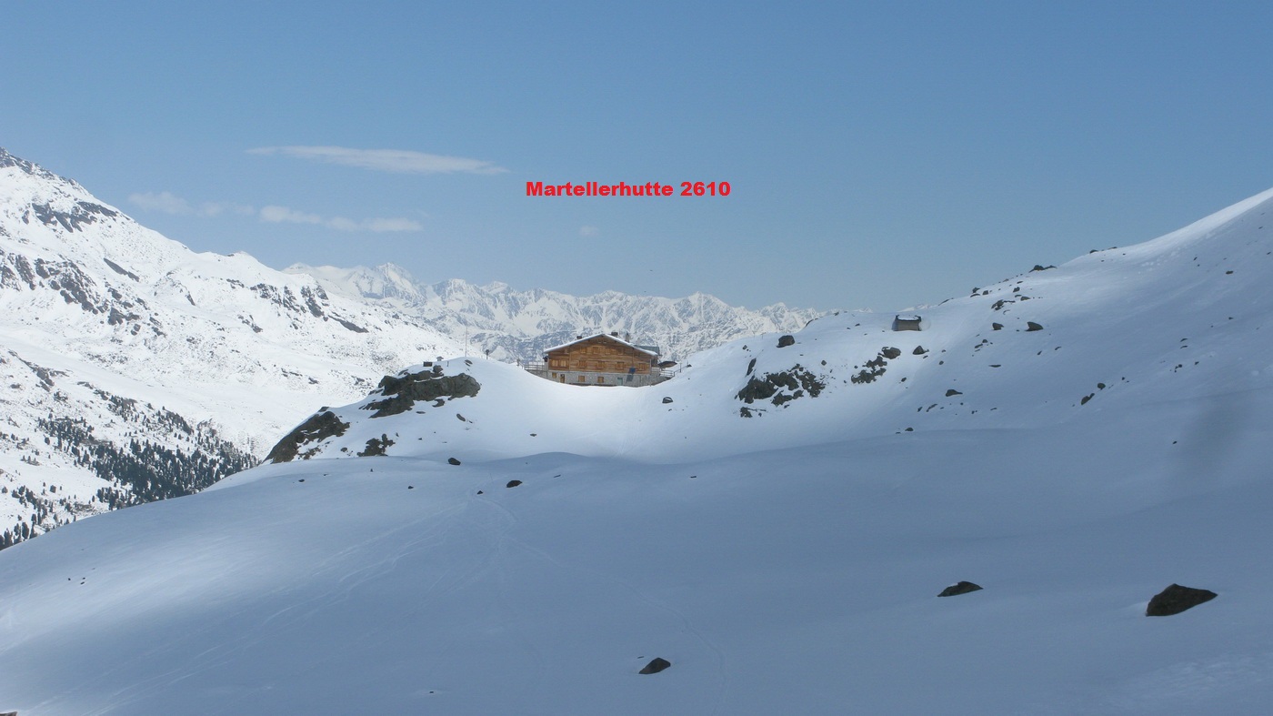 Keďže skialpinistov na konci zimy je tu neúrekom, k dispozícii je kúsok vyššie ďalšia chata: Martellerhutte. Tá však bola pri našej návšteve koncom apríla už zavretá. Minulá zima tu totiž bola chudobná na sneh, čo aj ovplyvnilo záver skialpovej sezóny. Akoby zázrakom však silné sneženie v druhej polovici apríla zachránilo sezónu aspoň na chvíľu.