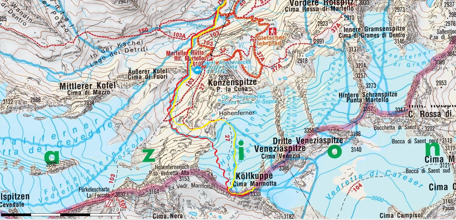 Popis výstupu: Od Zufallhutte sa cez terasy dostaneme na širolé plato. (FOTO) V pozadí vidieť Zufallspitzen. Po ľavej strane uvidíme múr malej priehrady. Prejdeme popri ňom a po chvíli sa dostaneme na križovatku. Vpravo dolina pokračuje smerom ku Casattihutte. My odbočíme vľavo širokým svahom prudko hore (šípka na fotke). Po výšľape na plošinu uvidíte vľavo Martellerhutte. Tu odbočíme vpravo a po chvíli sa začneme tlačiť vľavo do strmého svahu. Tu je viacej možností ako sa strmším svahom dostať na veľké ľadovcové plato pod vrcholom.