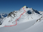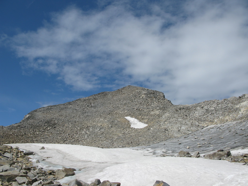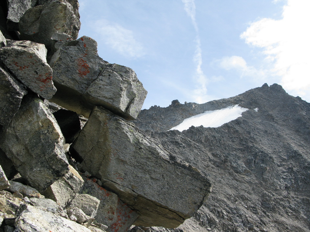 Po prekonaní nepríjemného zliezania, našťastie tiež opatreného záchytným balkónom, ešte síce nasleduje delikátny hrebienok, ale stupy a chyty sú tam, kde majú byť. A keď aj hlava je tiež... tak by nemal byť problém. Záverečný hrebienok z jednej strany olizuje snehové pole zmenšujúceho sa ľadovca severnej steny. Musel som ísť dokonca aj dva metre po snehu. Skaly sú tu na sebe naukladané tak, akoby sa mali každú chvíľu zosypať - takže pozor!