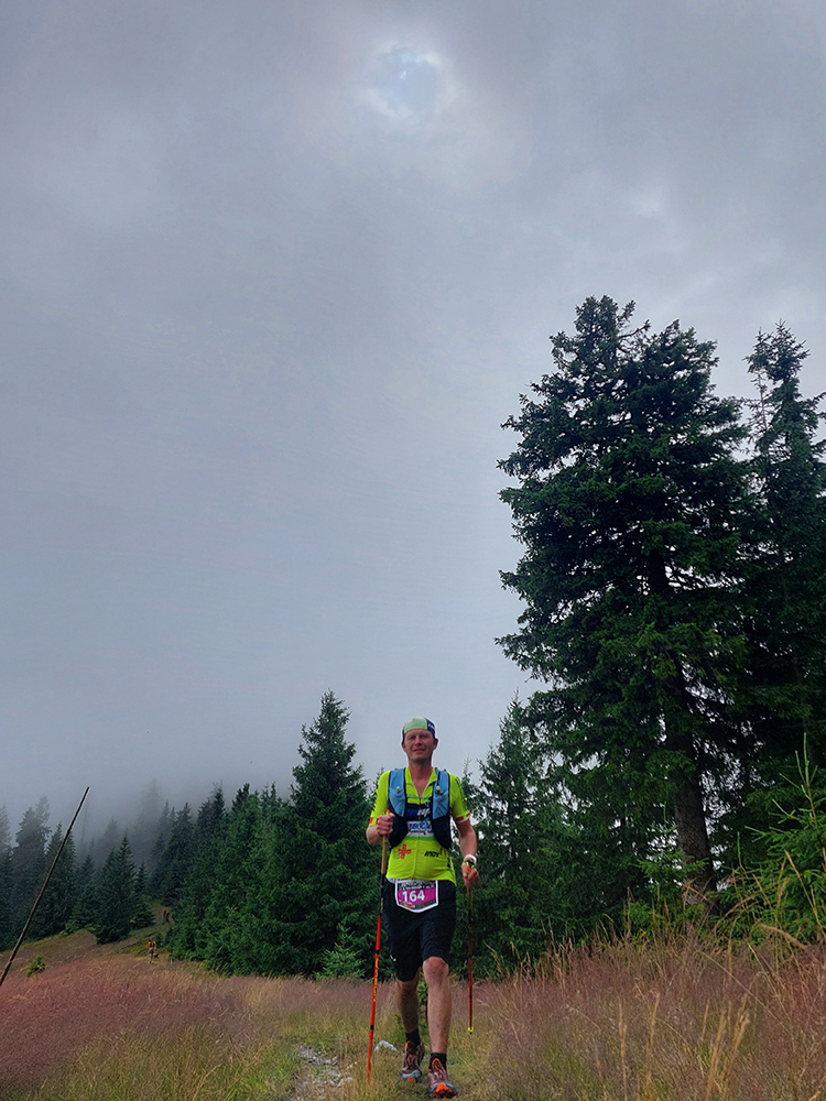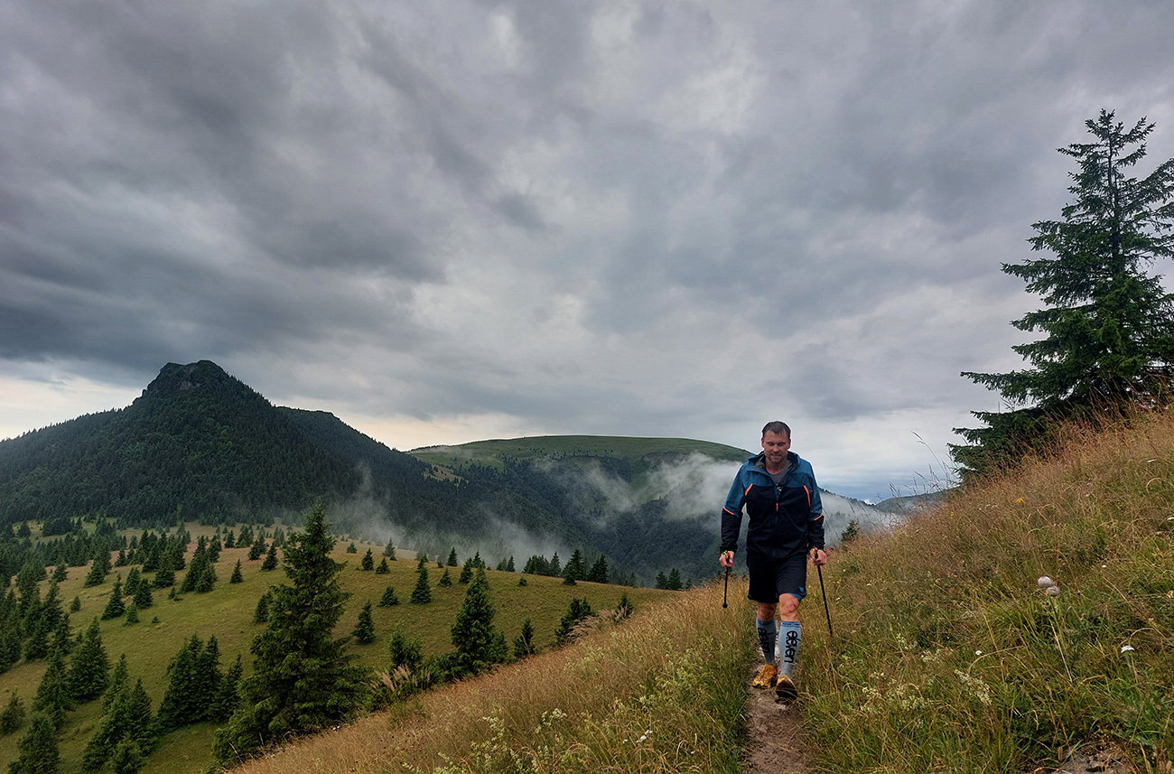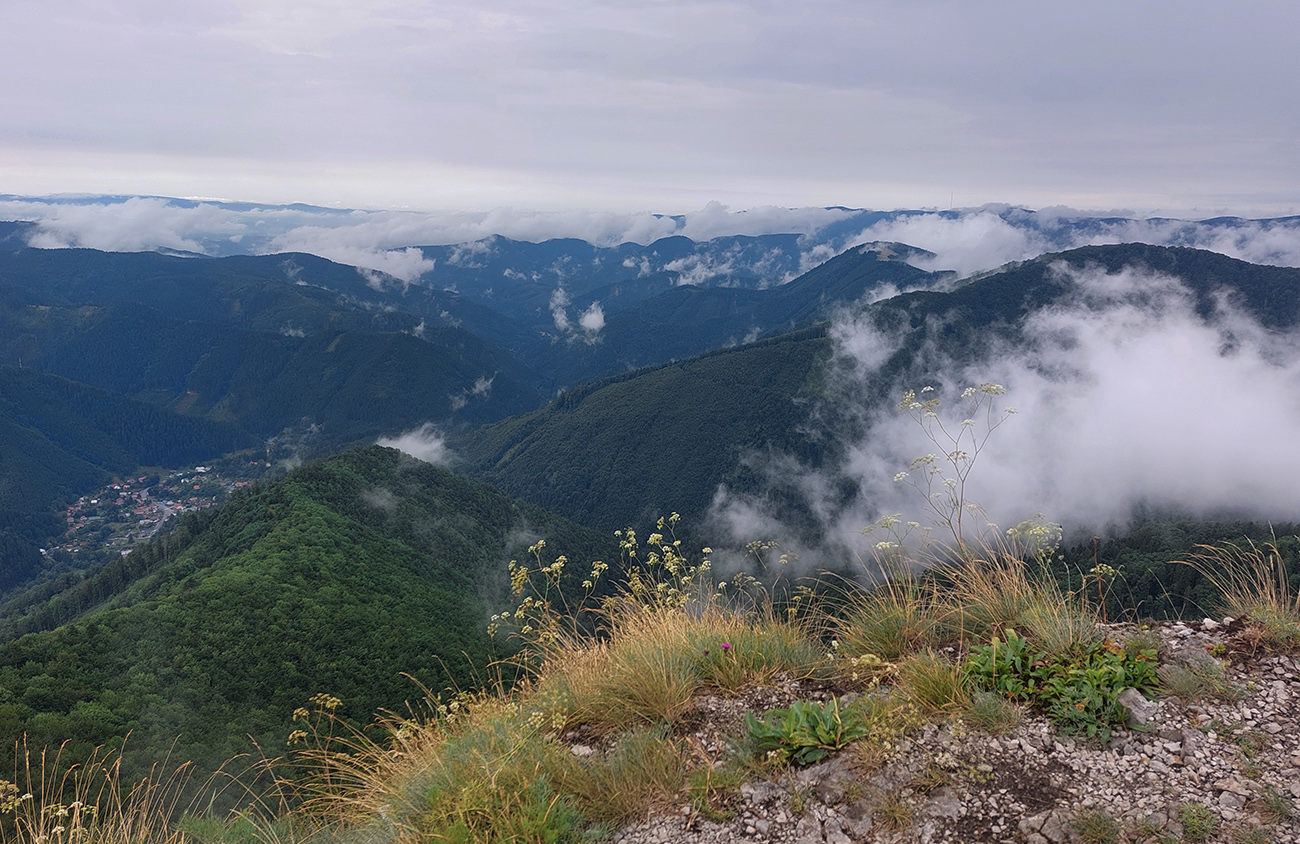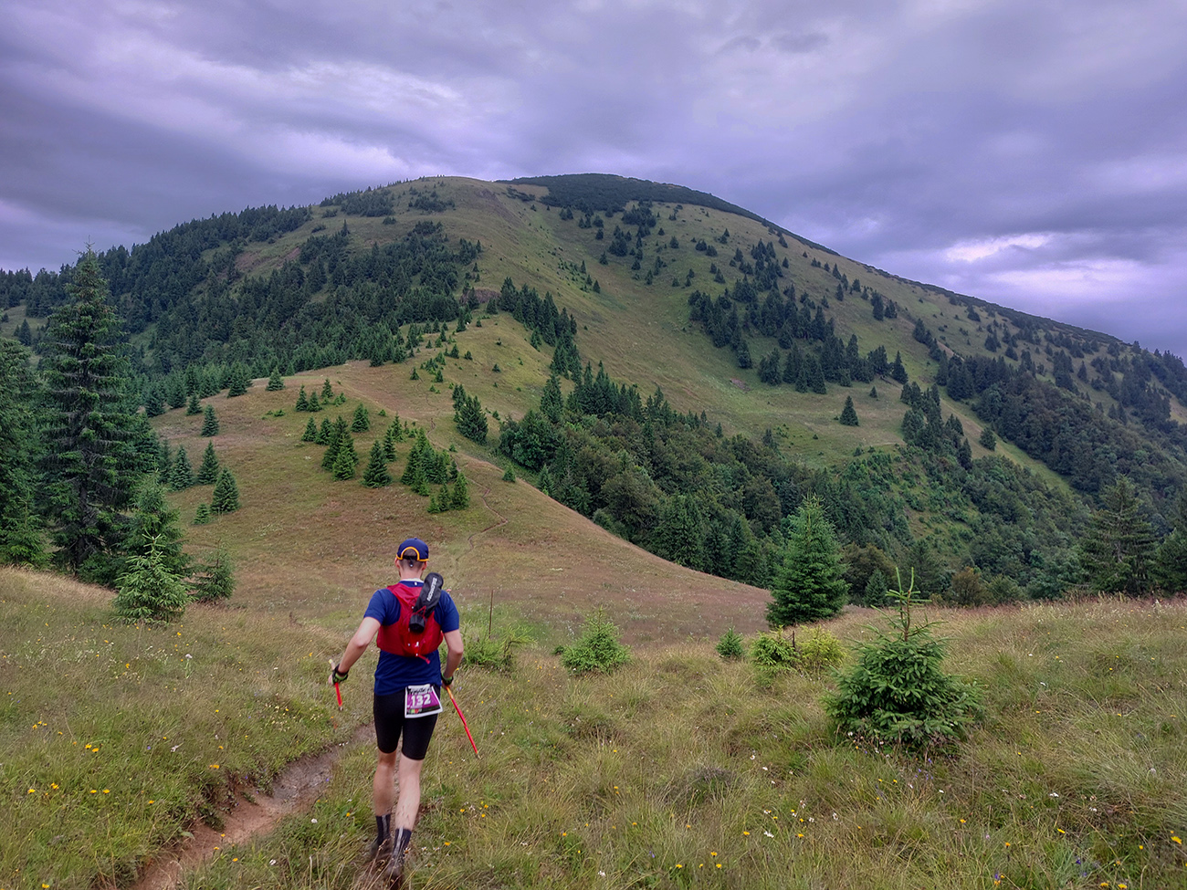 Predpeklie teda rýchlo prehrmelo a behanie až po K2 pod Borišovom (pre prvých hádam až po K3) bolo príjemné. Teda až na ten magľajz pod nohami na viacerých miestach, chcelo to zvlášť dobrý dezén. Teplota ideálna, ďaleké výhľady, biele útržky mrakov medzi kopcami a pod Ploskou stádo bečiacich kosačiek.