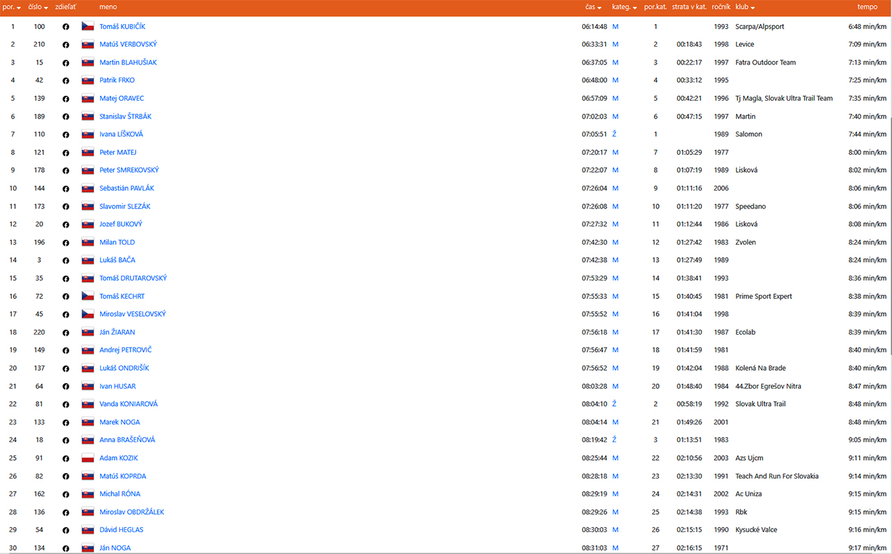 V cene štartovného bola (ako už tradične) aj balneoterapia, takže na boľavé nohy sa nemohol sťažovať ozaj nikto. Ale kedy vlastne bolo na Ultra Fatre normálne počasie? Blatko pod Japeňom bolo tento rok z oboch strán exkluzívne, čo bolo vidieť aj na mnohých zadkoch hneď na prvej kontrole v Starých Horách. Tam sa čelo pretekov dovalilo v maličkých rozostupoch v poradí Kubičík – Oravec – Blahušiak – Frko – Verbovský, ale až na budúceho víťaza, ktorý išiel systémom štart – cieľ, sa to za ním aj kvôli búrke trochu premiešalo. Dievčatá v poradí Líšková – Koniarová – Brašeňová išli od štartu za sebou ako dohodnuté.