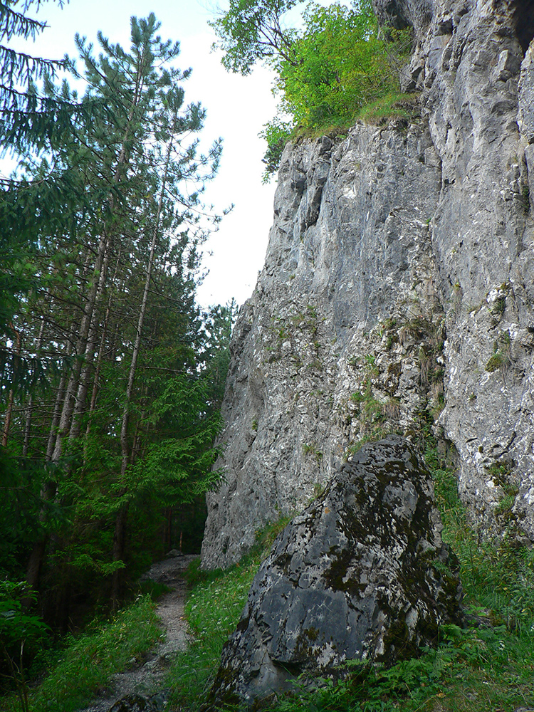 Potom ide chodník viac lesom, pohodlnejšie ako na Valientovom dieli (menší sklon aj menej suti pod nohami). A nie je to jednosmerka, dá sa tu motať pomedzi skaly a odskakovať na viaceré vyhliadky. Zostup na druhú stranu je poriadne prudký až do sedielka, kde sú zasa dve možnosti. Prvá je doprava - spomínaný záver Anakondy, veľmi pekný chodník. Ale ten som už spoznal, tak som to stočil doľava na „obchvat“ Hoblíka z východu. Tiež veľmi pekný singlík, aj popri ňom sú početné malé bralká. Záver má strmší, spája sa so zostupovým chodníkom priamo z vrcholu a lezie z lesa pod stožiarom elektrického vedenia. Tam si už každý vyberie, či sa hodí doľava a strmo zostúpi chodníkom do doliny, alebo menej strmo po ceste doprava, na lúku nad dedinou.