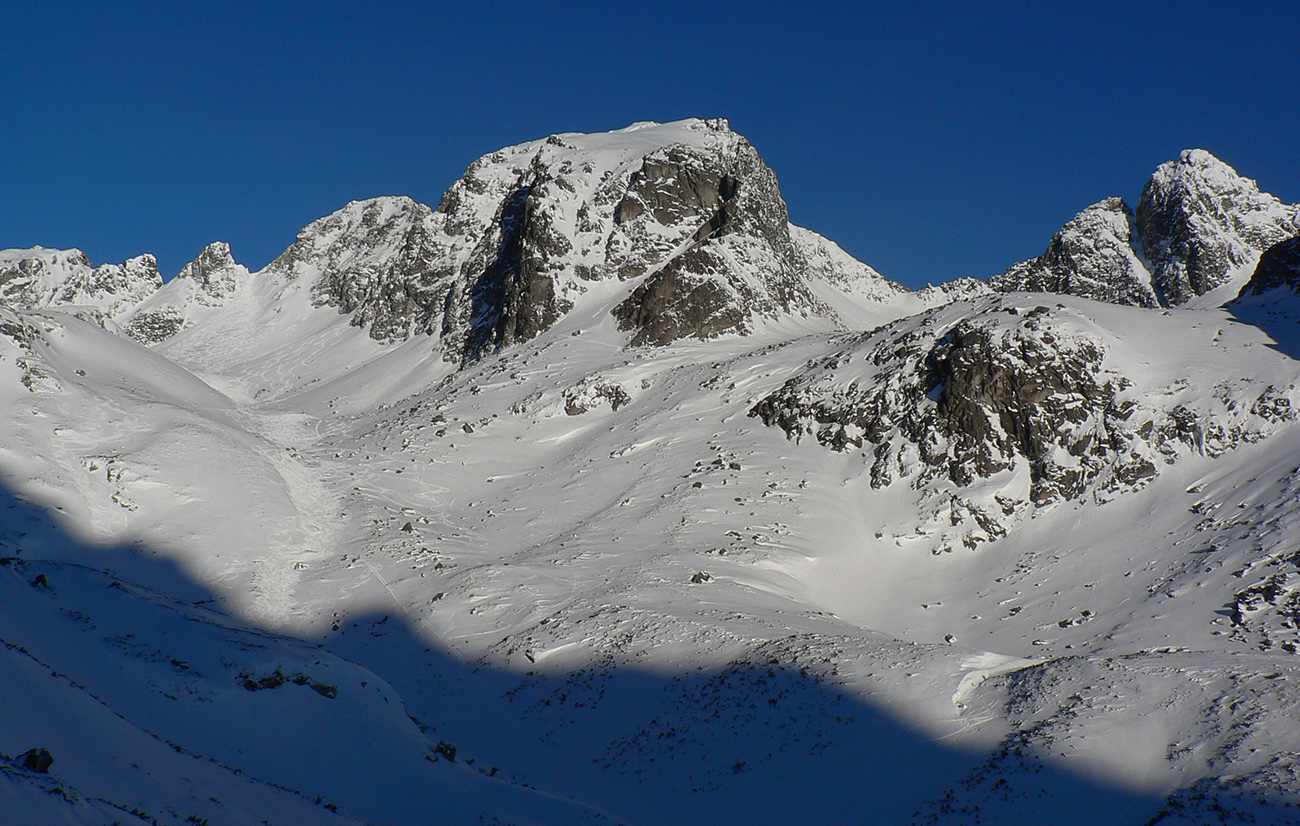 Takže ako prvý Prielom, celý v hlbokom tieni: stopa natiahnutá, ale zafúkaná, najmä v dolnej časti. A nie až hore – predchodca zrejme usúdil, že ten vrcholový prevej nie je moc bezpečný a ja som súhlasil. A mal som to za odmenu, nechcelo sa mi predupávať v tom kvante snehu, bola by to drina. Lyžovačka slušná, v hutnom, ufúkanom prašane, žraloky nehrýzli, len dole bolo treba na niektorých miestach zopatrnieť.