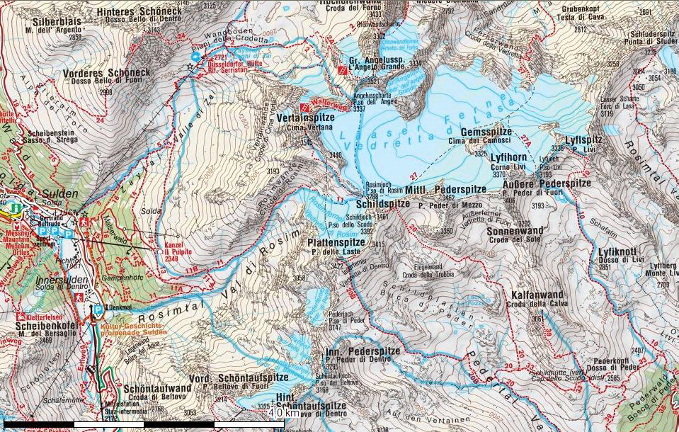 Vertainspitze vyčnievajúci nad Suldenom priam láka na podobné akcie. Po zimnom Verticali prišiel rad aj na leto. Táto celodenná túra s prevýšením takmer 1700 metrov dá určite zabrať. Stretnete tu ľudí aj so sedačkami, mačkami a výstrojou na ľadovce. Pre samotný výstup to však nie je potrebné. Ľadovec sa dá obísť po okraji. Rátajte s tým, že v hornej časti nie je žiadny značený chodník. Zopár mužíkov orientáciu zľahčuje. Pod vrcholom je tradične snehové pole.